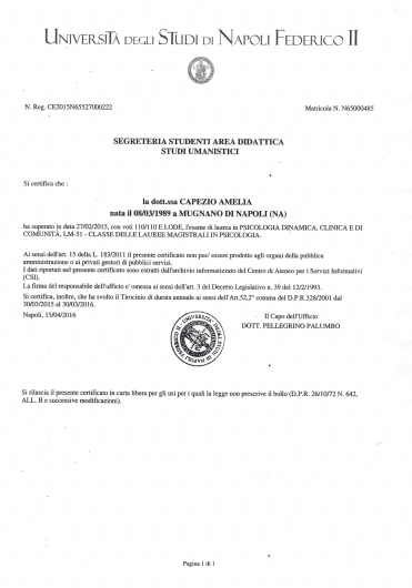 Consiglio a tutti la dottoressa Amelia. È di un' empatia, di una cultura, di un' efficacia incredibile. Con lei mi sono sentita accolta da subito e senza giudizio mi ha aiutata a trovare la soluzione più adatta a me. La consiglio assolutamente! Le sue parole sono come una cura e le porto con me sempre impresse nella mia mente. Grazie dottoressa perché grazie a voi ho scoperto una forza e un amore che avevo dimenticato di avere per me stessa.