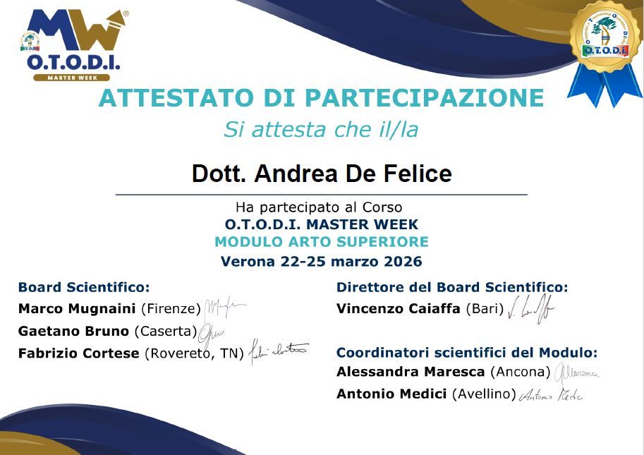 Ho conseguito la laurea in Medicina e Chirurgia presso l'Università degli Studi di Bari e il diploma di specializzazione in Ortopedia e Traumatologia presso l'Università degli Studi di Bari. Durante il percorso di studi ho approfondito le mie competenze presso l'Ortopedia e Traumatologia del Policlinico Universitario di Bari, dell'Ospedale Pediatrico Giovanni XXIII, dell'Ospedale Di Venere a Bari e la chirurgia protesica dell'Ospedale Santa Maria degli Angeli a Putignano. Ho preso parte a corsi di approfondimento del distretto piede, teorici e pratici con preparati anatomici dedicati (ICLO, Verona). Da Giugno 2022 lavoro come chirurgo ortopedico presso il reparto di Ortopedia e Traumatologa all'Ospedale San Giacomo di Monopoli diretta dal Dott. Oronzo De Carolis. Nel 2025 consegue il titolo di chirurgo ortopedico protesizzatore certificato sulla chirurgia di ginocchio, presso la SIOT Academy.