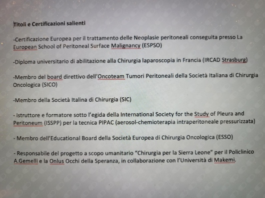 Sono esperto nel trattamento delle neoplasie gastrointestinali avanzate associando alla asportazione chirurgica una chemioterapia intraoperatoria intraperitoneale quale la Chemioipertermia (HIPEC) o la Chemioterapia Aerosolica Pressurizzata (PIPAC).
