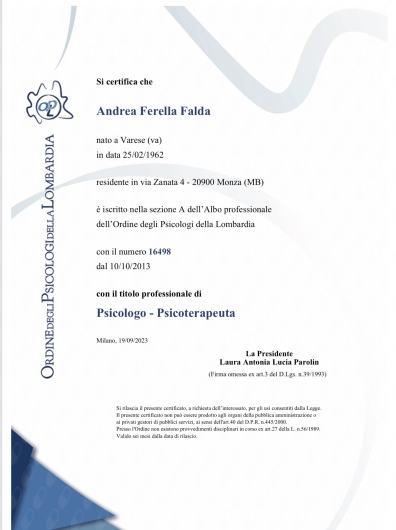 Iscritto all’Ordine degli Psicologi della Lombardia n.16498;