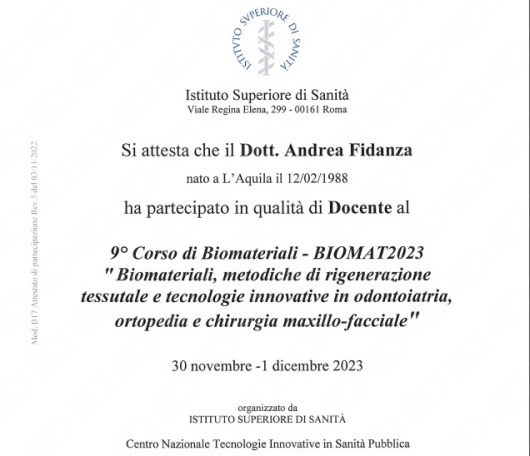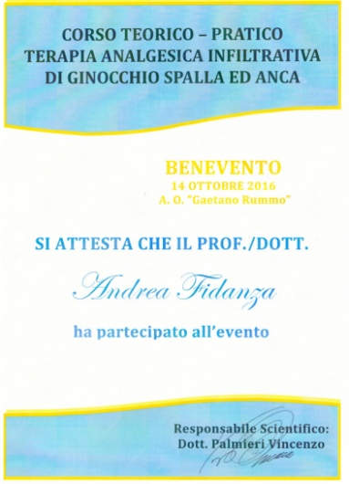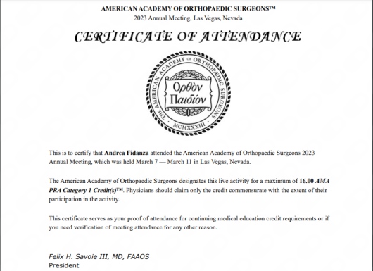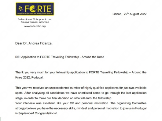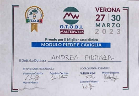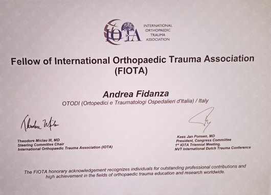 Sono stato designato Fellow of International Orthopaedic and Trauma Association dall'organizzazione nazionale di Ortopedici e Traumatologi ospedalieri d'Italia, di cui ne sono referente nazionale per i giovani colleghi under 40.