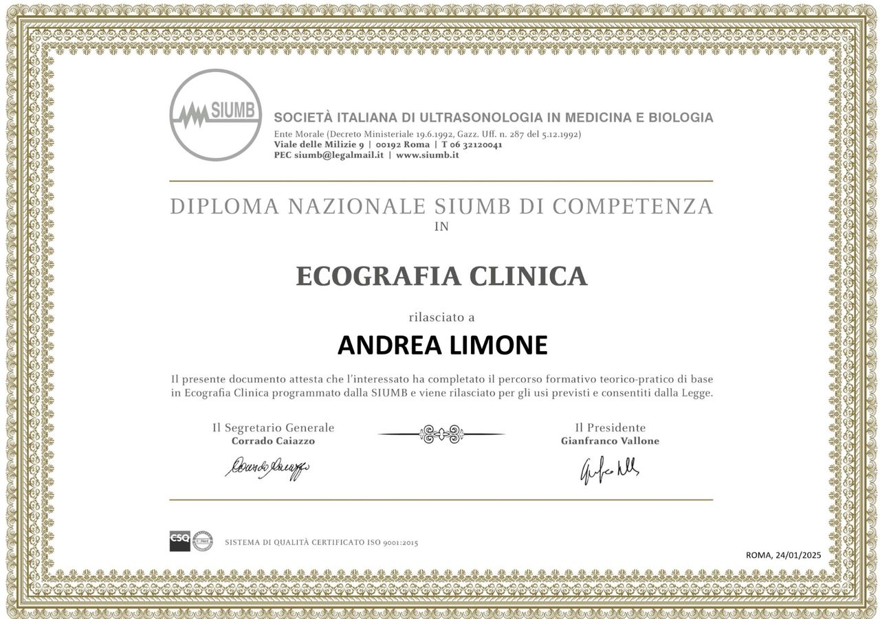 Ho conseguito a pieni voti il titolo di Specialista in Malattie Infettive e Tropicali e sono iscritto alla Società Italiana di Ultrasonologia in Medicina e Biologia - SIUMB avendo ottenuto il Diploma Nazionale in Ecografia Clinica.