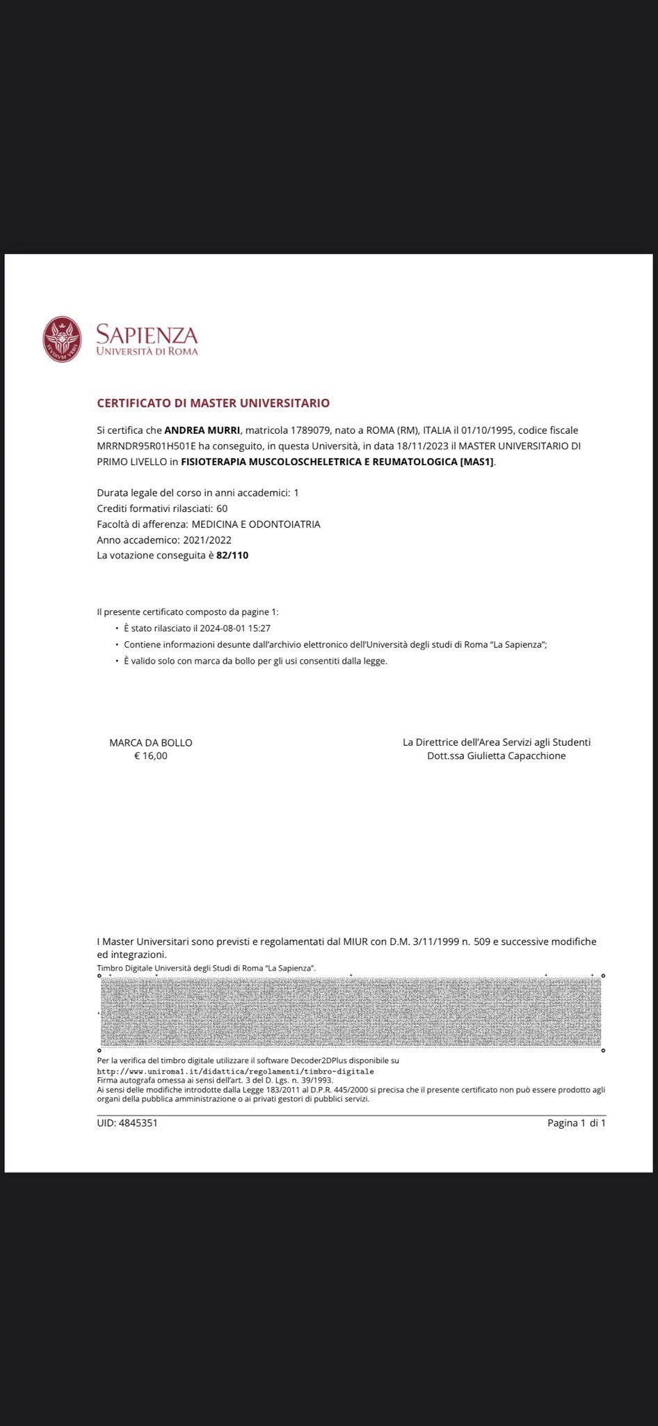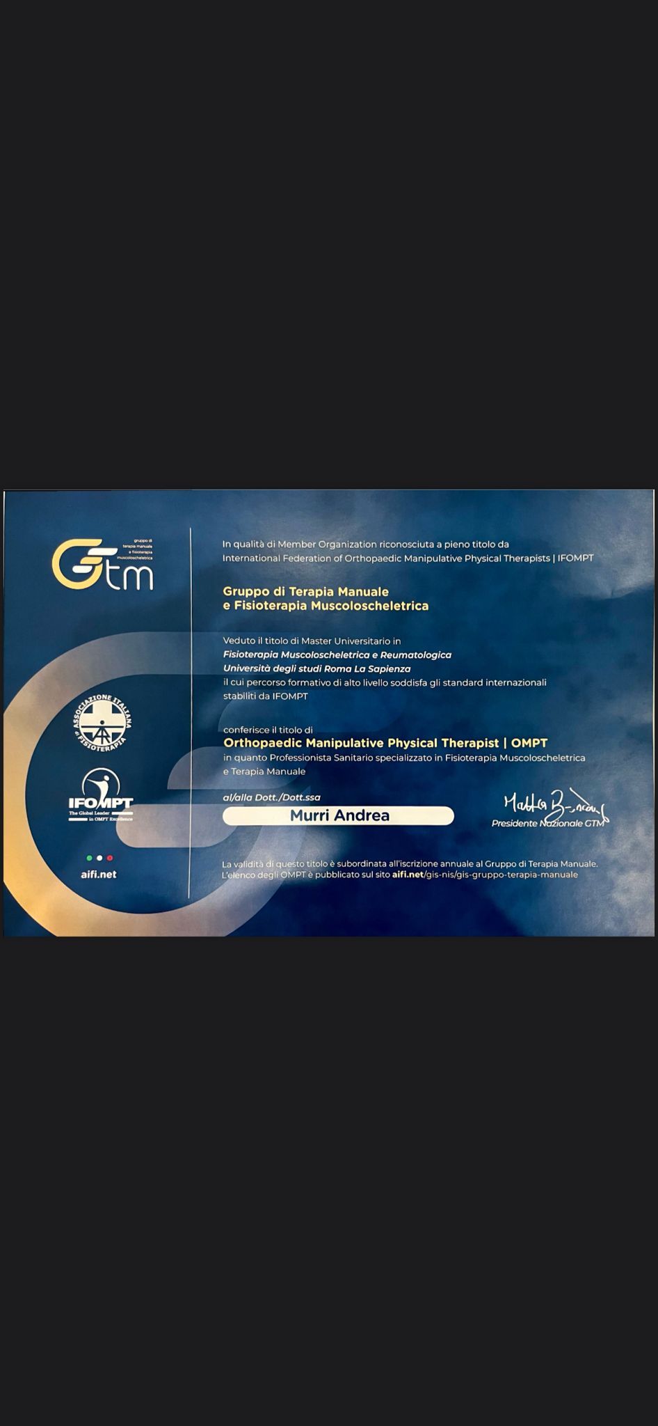 Fisioterapista (OMPT - Fisioterapista Ortopedico Manipolativo) specializzato in terapia manuale e nella gestione delle condizioni neuromuscoloscheletriche e reumatologiche.