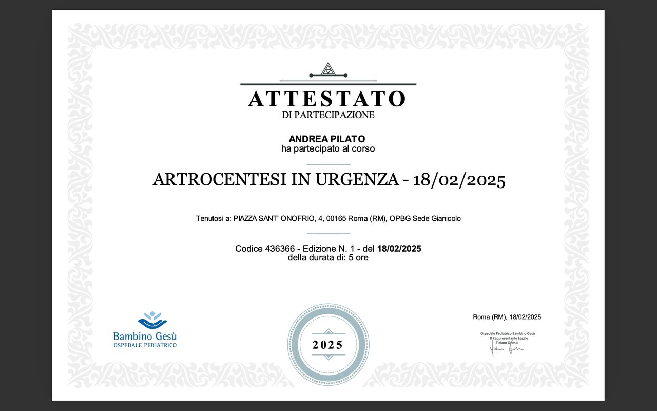 Collaboro con l’Ospedale Pediatrico Bambino Gesù di Roma per finalità cliniche e scientifiche, occupandomi della presa in carico e del follow-up di adolescenti e giovani adulti con patologie reumatologiche a esordio pediatrico.