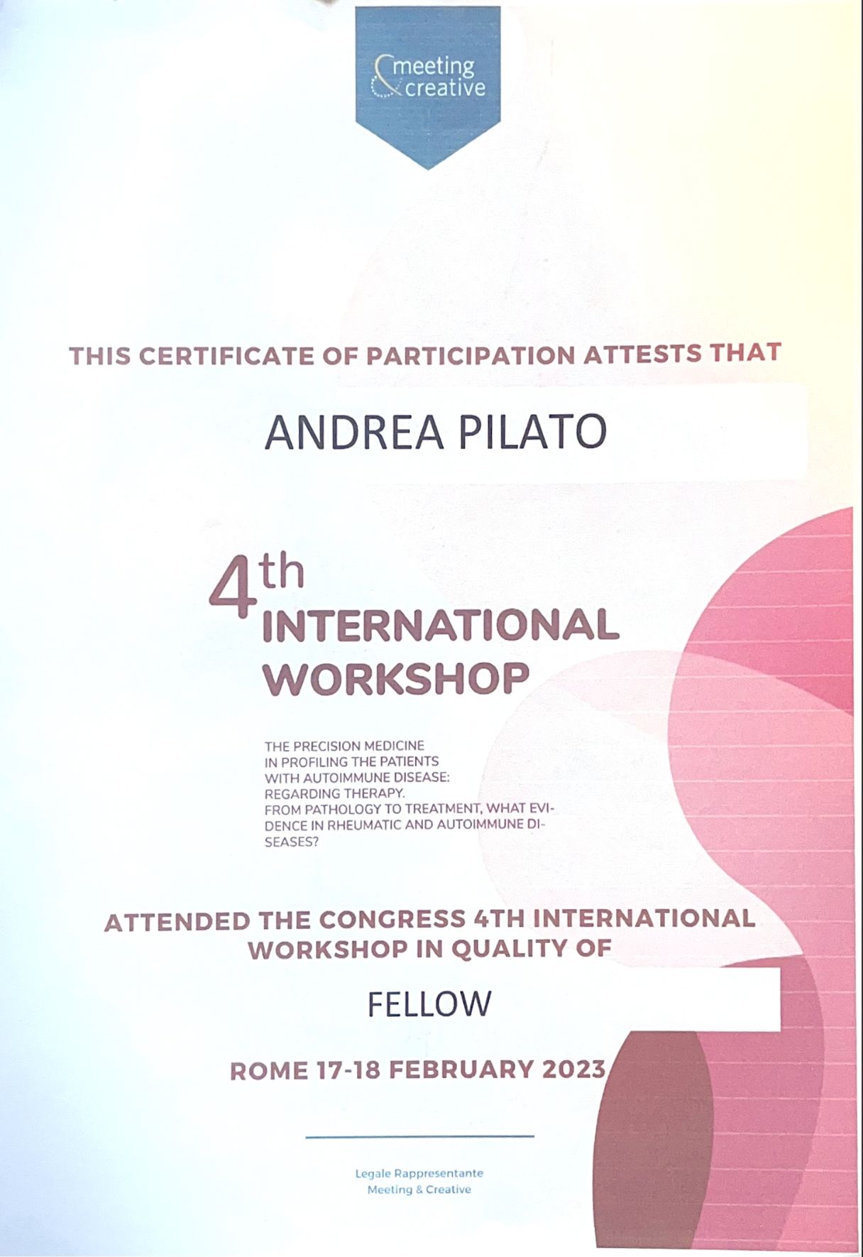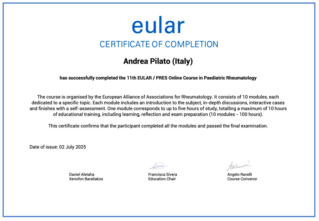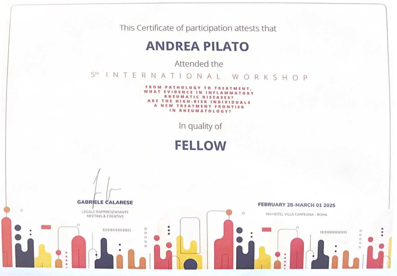 Sono membro della Società Italiana di Reumatologia (SIR) e del Gruppo Italiano di Ricerca in Reumatologia Clinica e Sperimentale (GIRRCS) e svolgo attività di ricerca clinica, con contributi scientifici in ambito nazionale ed internazionale con le principali società di settore (EULAR, PReS).