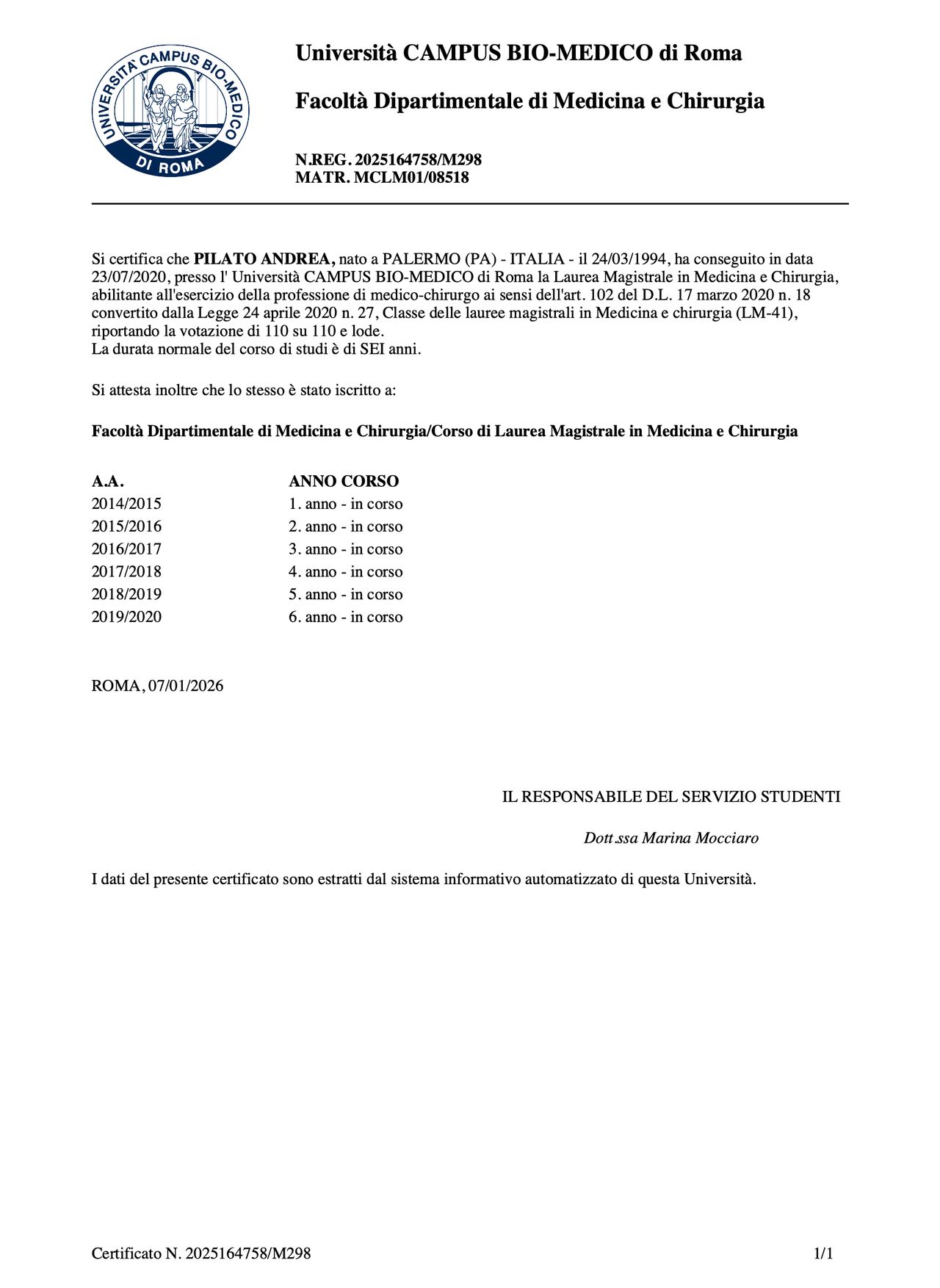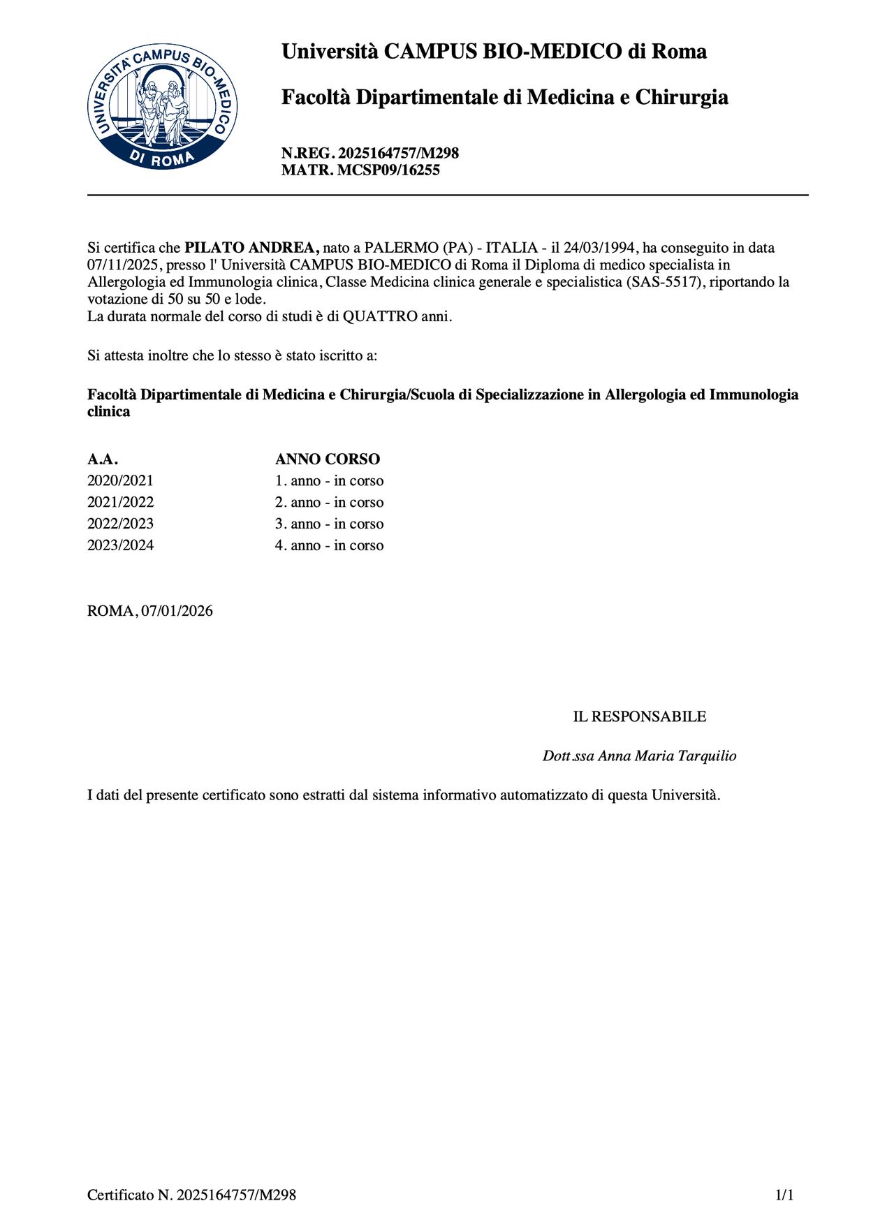 Fin dagli anni universitari, il mio interesse accademico e professionale si è orientato verso lo studio del sistema immunitario e delle patologie legate alla sua disregolazione. Mi sono formato presso la Scuola di Specializzazione in Immunologia Clinica dell’Ospedale Universitario Campus Bio-Medico di Roma, dove ho maturato una solida esperienza in ambito immuno-reumatologico, acquisendo competenze specifiche nella gestione delle principali malattie autoimmuni e infiammatorie croniche dell’età adulta e pediatrica. Ho esperienza nell’utilizzo di farmaci immunosoppressori, convenzionali e biologici, con particolare attenzione al corretto bilanciamento tra efficacia e sicurezza del trattamento.