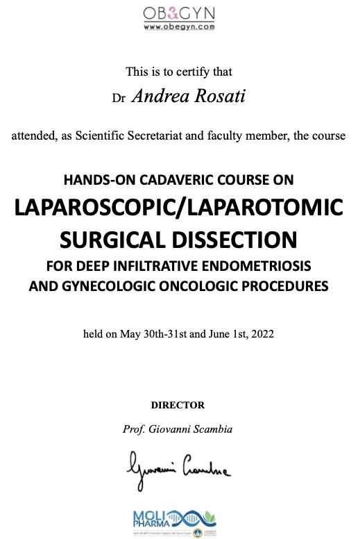 Sono un ginecologo e lavoro presso la Fondazione Policlinico Universitario A. Gemelli IRCCS (Istituto di Ricovero e Cura a Carattere Scientifico) di Roma. Dopo la laurea con lode e menzione d’onore in Medicina e Chirurgia e la specializzazione in Ostetricia e Ginecologia, ho completato un Master di II livello in Ginecologia Oncologica, una fellowship in Ginecologia Oncologica accreditata dall’ESGO (European Society of Gynaecological Oncology) e sono attualmente dottorando di ricerca in Scienze della Nutrizione, del Metabolismo, dell’Invecchiamento e delle Patologie di Genere presso l’Università Cattolica del Sacro Cuore.