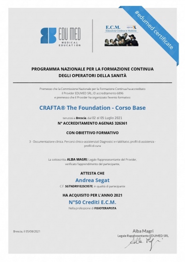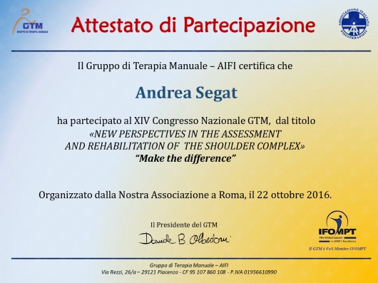 Nel 2020 ho conseguito con Lode il titolo di "Fisioterapista Manuale Ortopedico (OMPT)" al Master di I° livello in Fisioterapia Muscoloscheletrica e Reumatologica degli Studi di Roma “Tor Vergata”. Questo percorso, riconosciuto a livello internazionale, rappresenta l'apice della formazione di un Fisioterapista in ambito muscoloscheletrico.