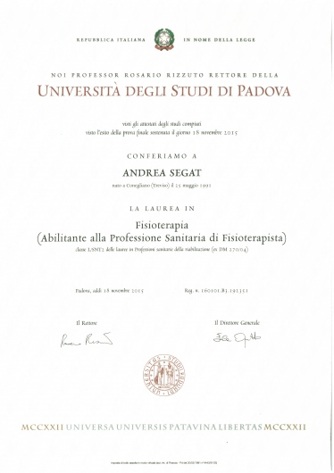Ho conseguito la Laurea in Fisioterapia nel 2015 presso l’Università degli Studi di Padova con il massimo dei voti.