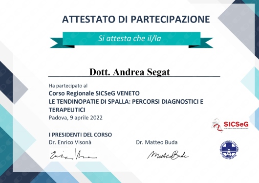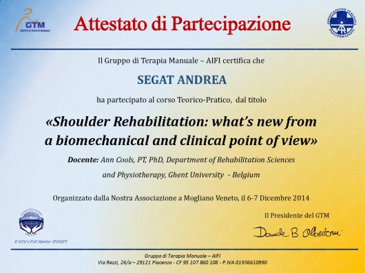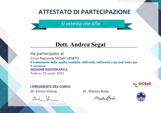 Sono socio dell’Associazione Italiana di Fisioterapia e del Gruppo di Terapia Manuale, non che iscritto Ordine interprovinciale della professione sanitaria di Fisioterapista di Belluno, Treviso, Vicenza e Verona, n°365.