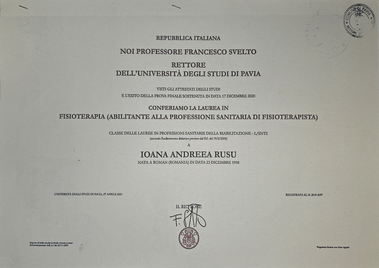 Sono il Dott.ssa Andreea Rusu del centro di fisiochinesiterapia Bertolotti, fondato nel 1970 a Pavia. La nostra missione medica è quella di alleviare il dolore dei pazienti e di aiutare il malato nel recupero e nel reintegro con il massimo livello di efficienza possibile. Alla nostra grande esperienza, si accompagna l'utilizzo delle più moderne apparecchiature e degli strumenti di ultima generazione per garantire il recupero dei nostri pazienti.