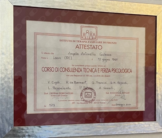 La psicoterapeuta Galasso è iscritta all’Albo dei Medici Chirurghi della provincia di Frosinone con n. 3045 dal 1999 ed è particolarmente competente in psicologia giuridica, svolgendo l’attività di consulenza tecnica e peritale e di mediazione sistemica.