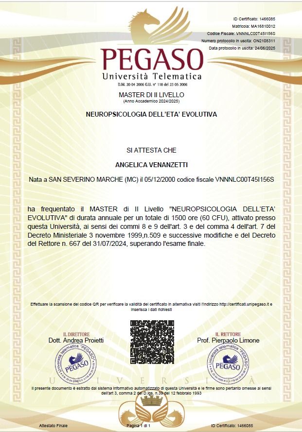 La mia formazione professionale è proseguita mediante un master universitario di secondo livello in Neuropsicologia dell'età evolutiva.