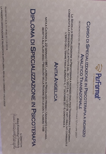 Sono la Dott.ssa Anita Angelica, psicologa e psicoterapeuta ad indirizzo Analitico Transazionale.