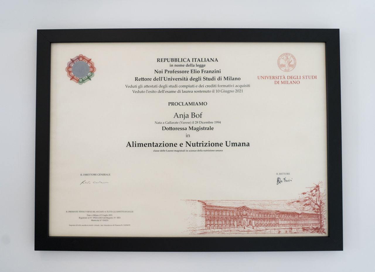 Dopo la laurea triennale in Scienze e Tecnologie Alimentari, ho conseguito la laurea magistrale in Alimentazione e Nutrizione Umana, interfacoltà con Medicina e Chirurgia presso l'Università degli Studi di Milano e mi sono abilitata alla professione di Biologa Nutrizionista presso l'Ordine dei Biologi della Lombardia. Ho poi proseguito il mio percorso con corsi di formazione specialistica relativi all'ambito clinico, oncologico e sportivo.