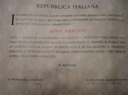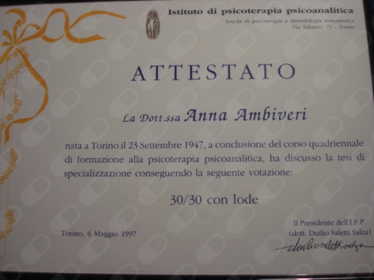 Sono laureata in psicologia clinica presso la Facoltà di Magistero di Padova e in pedagogia presso la Facoltà di Magistero di Torino. Specializzata in psicoterapia psicoanalitica presso l’IPP, Istituto di Psicoterapia Psicoanalitica di Torino.