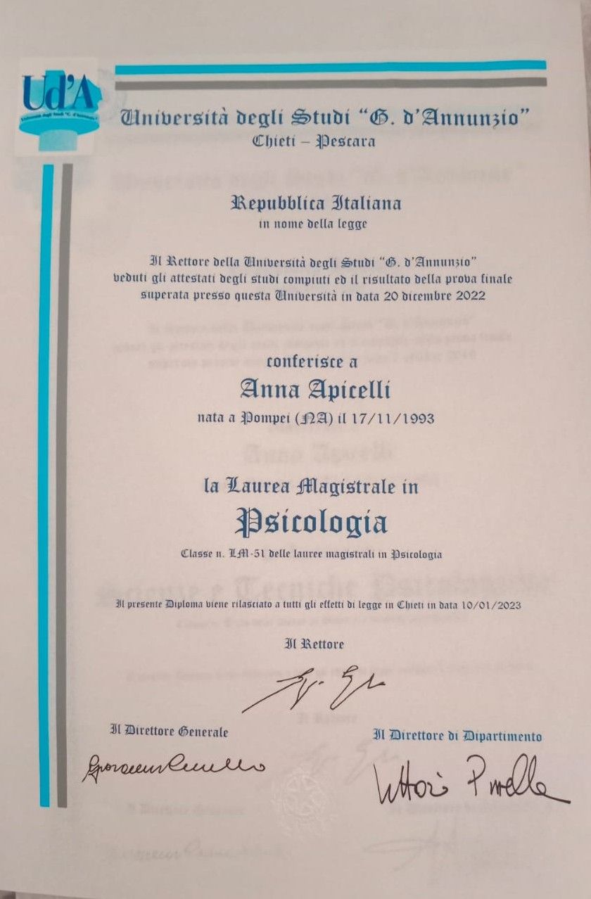 Sono Anna Apicelli, Psicologia iscritta all'ordine degli Psicologi della Toscana.