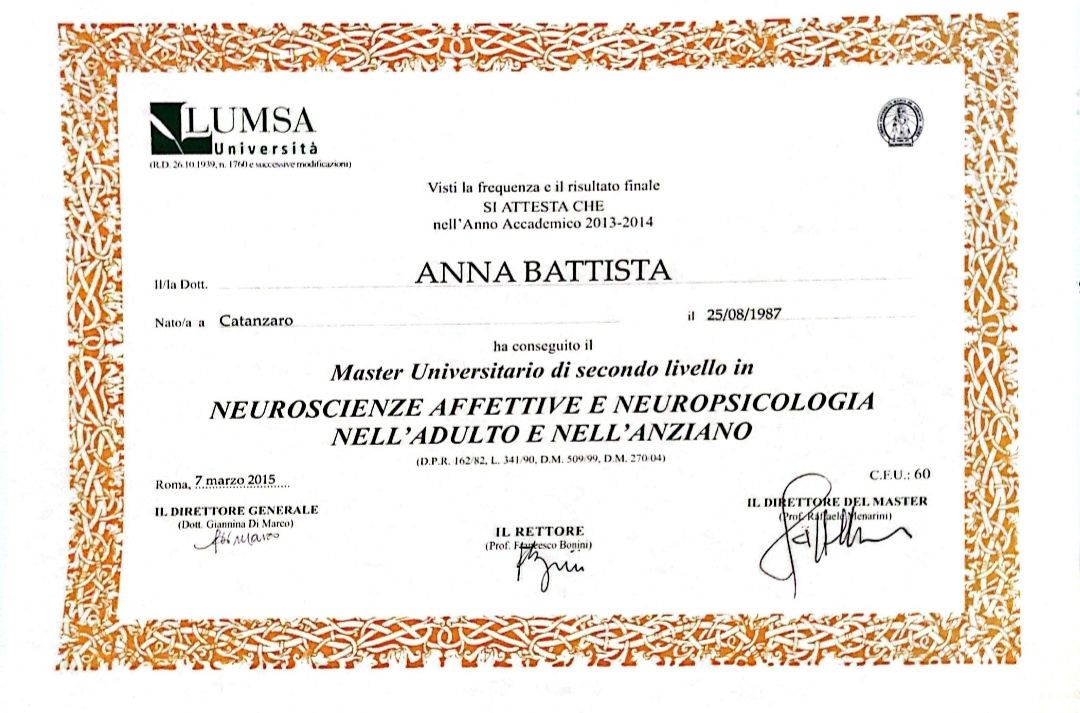 Con la Dott. Ssa Anna Battista, abbiamo intrapreso con mia madre un percorso di stimolazione cognitiva, fin dal primo incontro e durante ci siamo sentiti affiancati nell'affrontare questo percorso, con professionalità, competenze ed empatia, abbiamo compreso come la realtà può essere vissuta con occhi diversi, seguendo una "logica diversa", superando paure e ansie, ma soprattutto non sentirsi "fuori luogo".