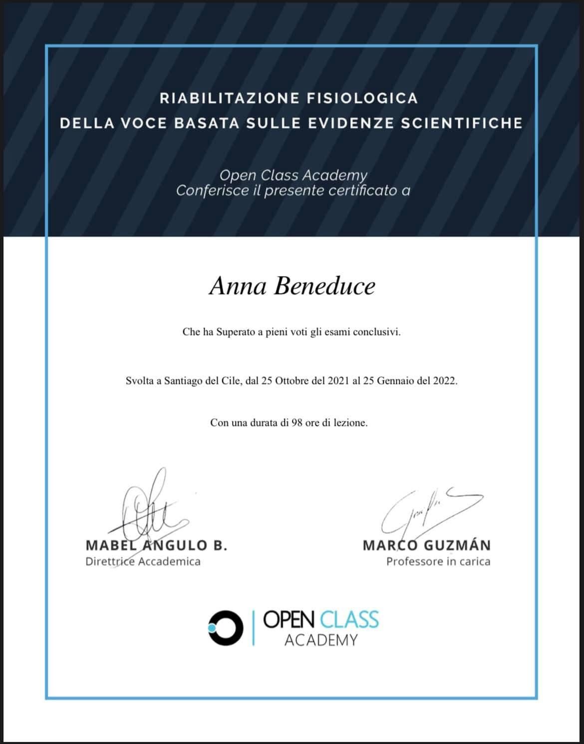 Mi chiamo Anna Beneduce e sono Logopedista Magistrale, specializzata nella valutazione, consulenza e trattamento dei disturbi della voce parlata, cantata e recitata.