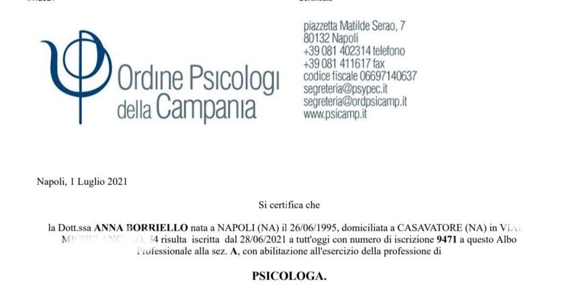 Sono la Dott.ssa Anna Borriello, psicologa clinica e scolastica iscritta all’Ordine degli Psicologi della Regione Campania (n. 9471).