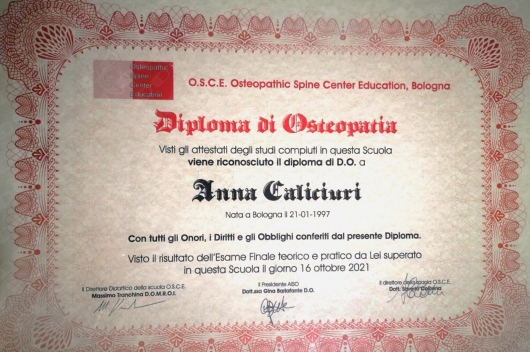 Il primo contatto con questa disciplina è avvenuto come paziente e fin da subito sono stata rapita dalla bravura, dalla precisione e dalla passione che l'osteopata impiegava durante il trattamento; lì ho capito che avrei voluto rubare i segreti del mestiere per far star meglio le persone e così ho fatto.