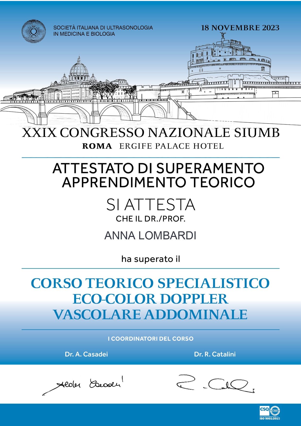 Ho inoltre frequentato i seguenti corsi specialistici: - Corso Teorico di Formazione in Ultrasonologia SIUMB - Corso teorico-pratico biennale di Ecografia Internistica SIUMB, presso la scuola “EcoCotugno” con superamento esame finale con voto 70/70 e lode - Corso teorico-pratico di Ecocolordoppler Internistico e Vascolare Periferico presso la scuola “EcoCotugno” - Corso di Ecocolordoppler Vascolare presso l'Ospedale C.T.O., Napoli - Corso di Ecografia in Urgenza ed Emergenza presso l'Ospedale A. Cardarelli di Napoli.