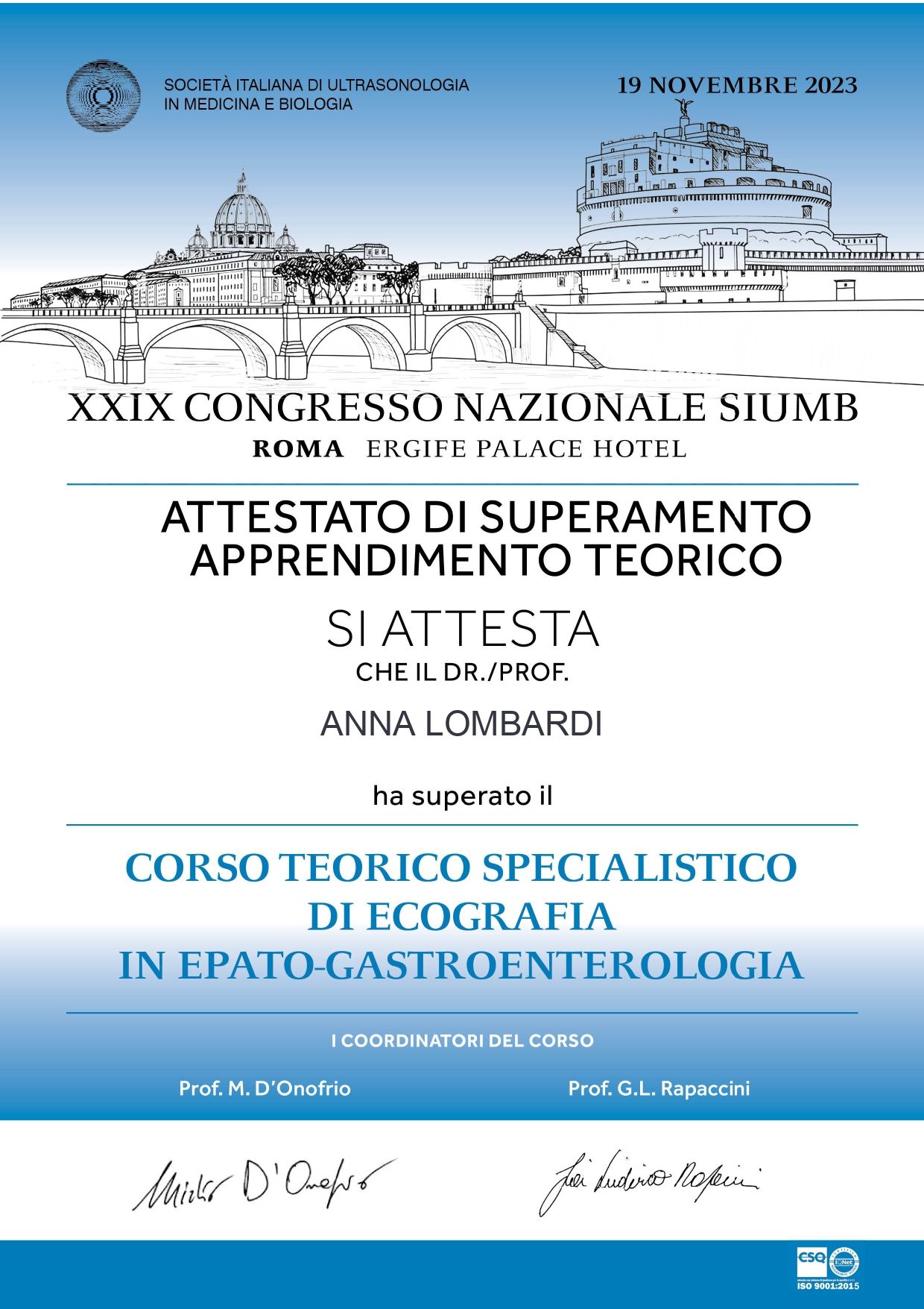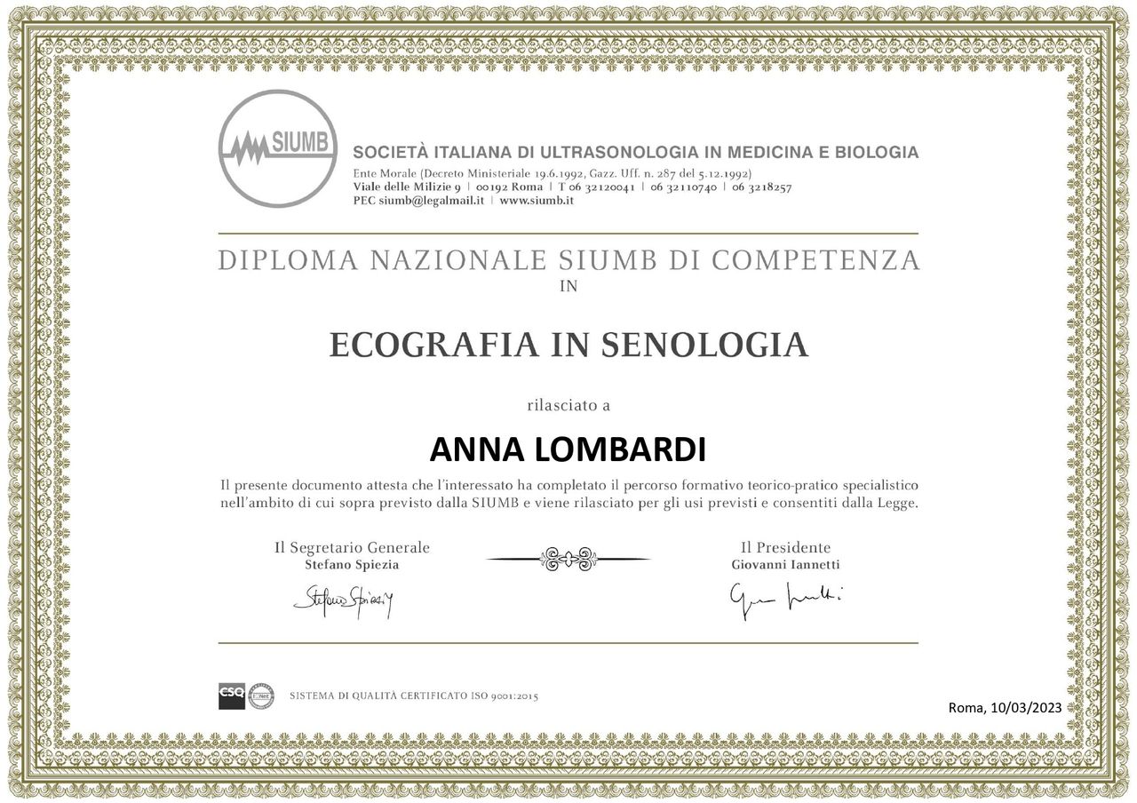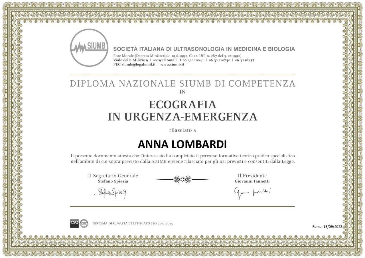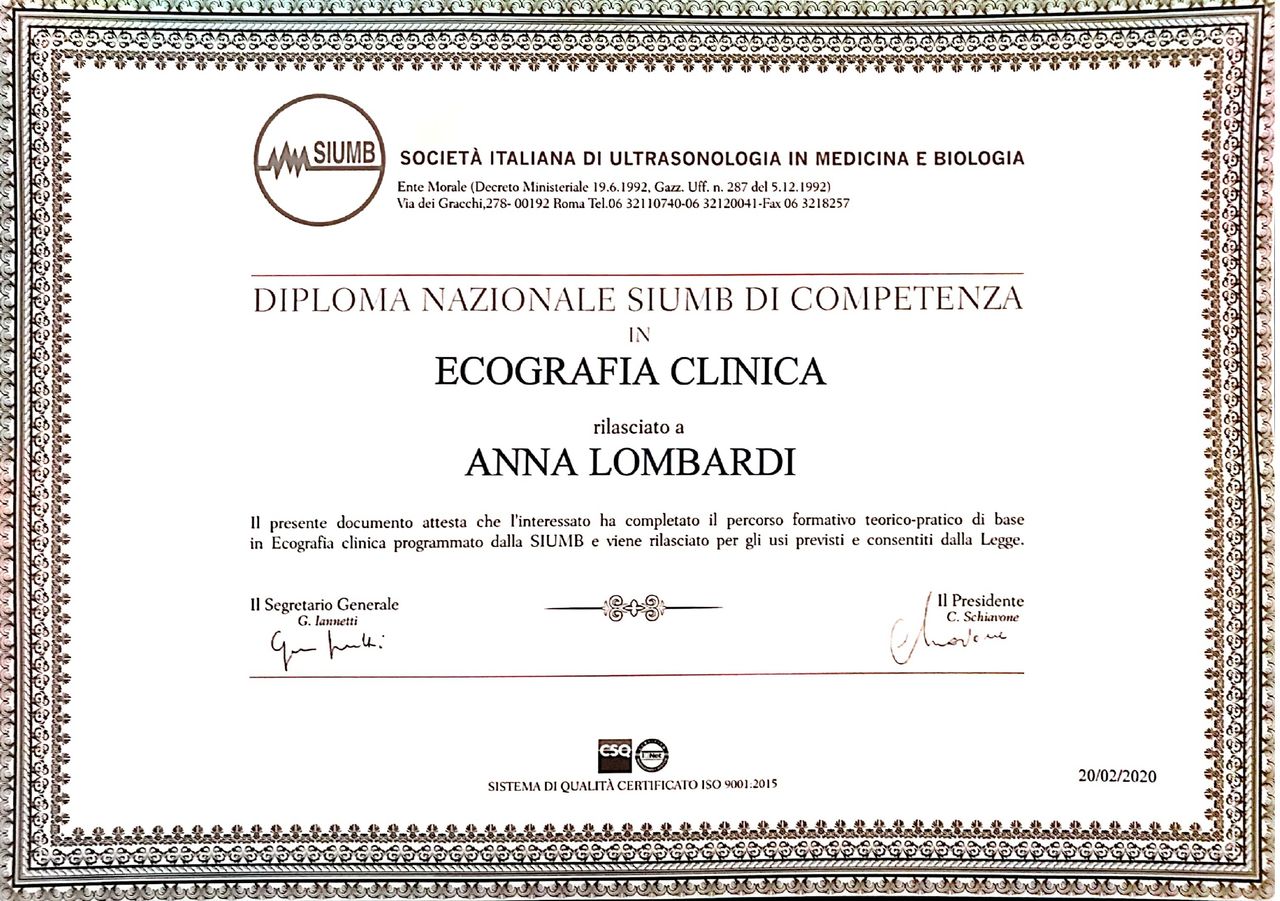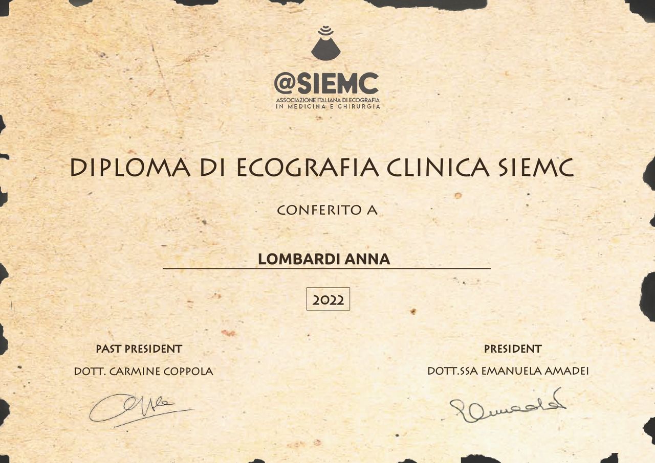 Contestualmente mi sono formata in Ecografia Internistica e sono in possesso del Diploma Nazionale SIUMB di ecografia (Società Italiana di Ultrasonologia in Medicina e Biologia) e SIEMC (Società Italiana di Ecografia in Medicina e Chirurgia).