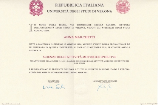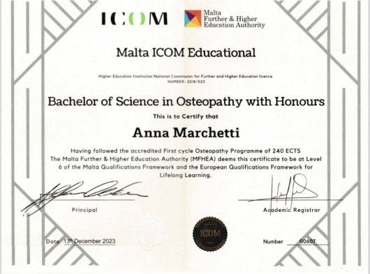 Sono la Dott.ssa Anna Marchetti, Osteopata diplomata presso ICOM Malta (International College of Osteopathic Medicine) di Cinisello Balsamo. Frequentando le lezioni tra l'Italia e Malta e svolgendo più di 1000 ore di tirocinio clinico, mi è stata rilasciata una Laurea Europea in Osteopatia (Bachelor in Osteopathy with Honours Bsc.Hons.Ost). Inoltre, dispongo di una Laurea triennale in Scienze Motorie conseguita nel 2018 all'Università degli studi di Verona, dopo il diploma scientifico ottenuto nel 2015. Ho frequentato il Master in Osteopatia Pediatrica presso il centro di formazione FOB di Brescia, che mi permette di avere una specializzazione nel trattamento dei bambini dalla nascita fino alla prima adolescenza.