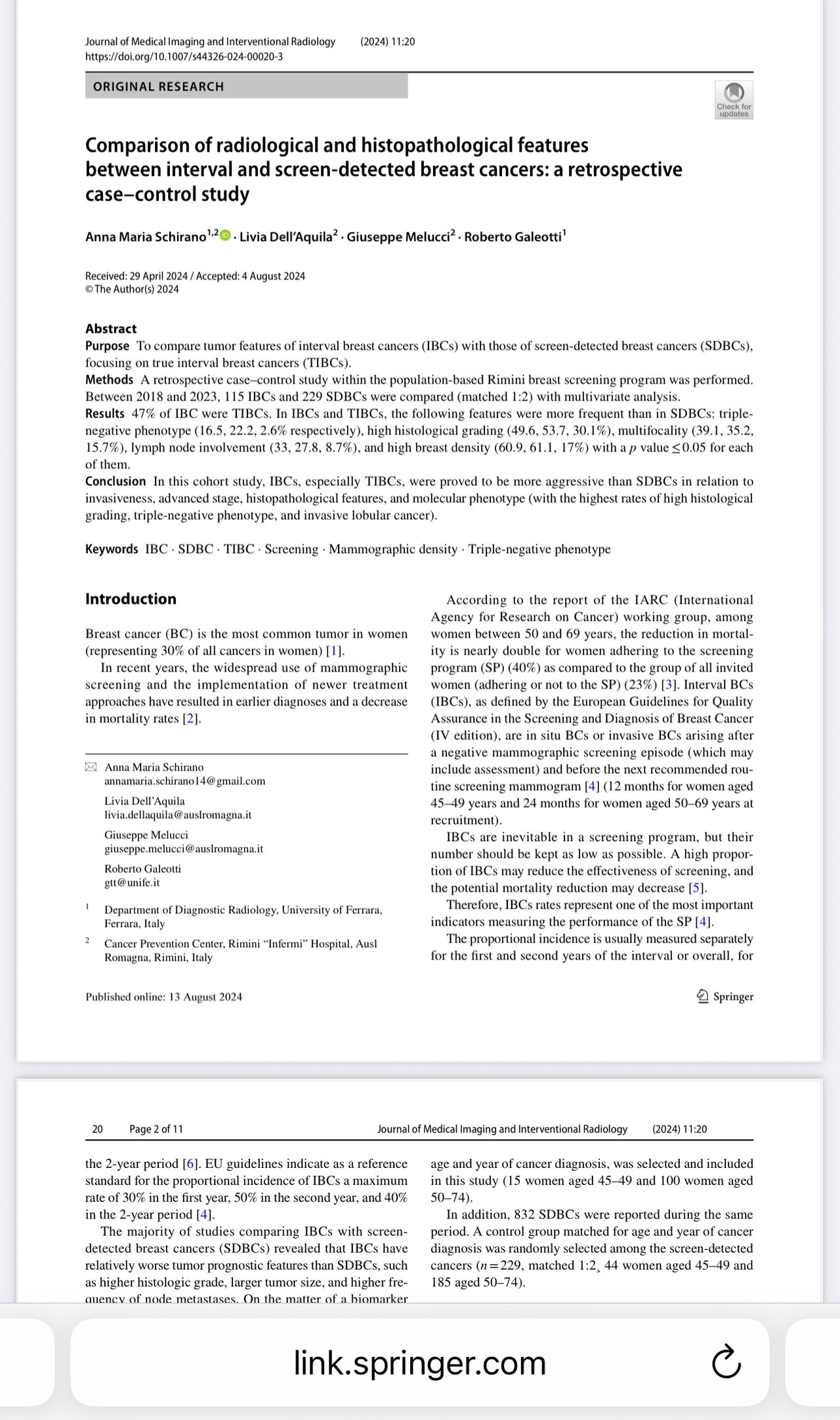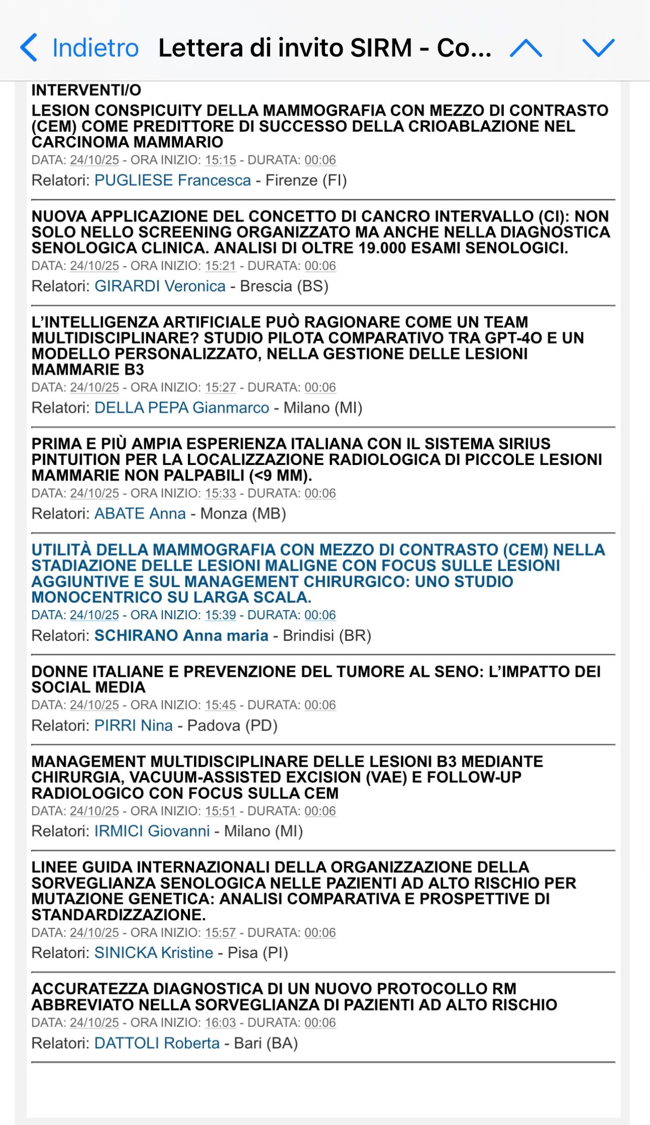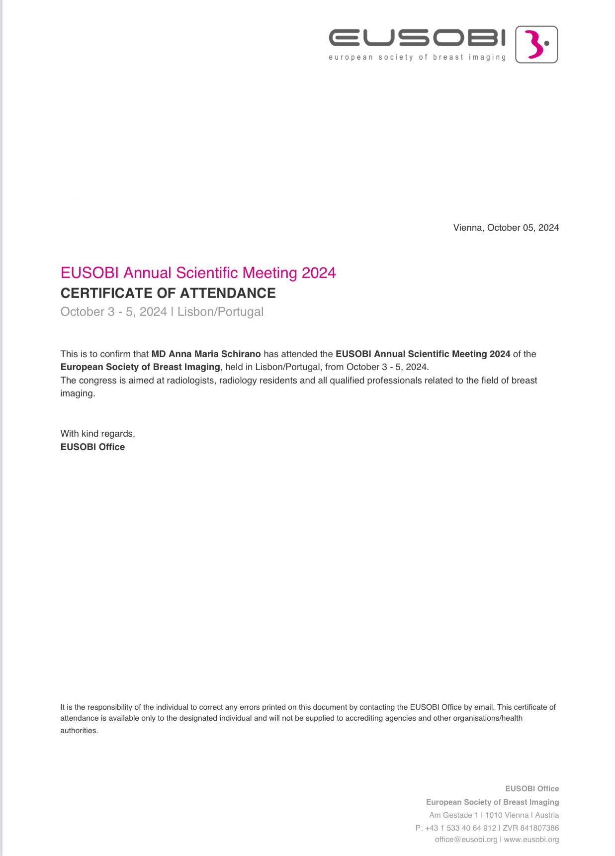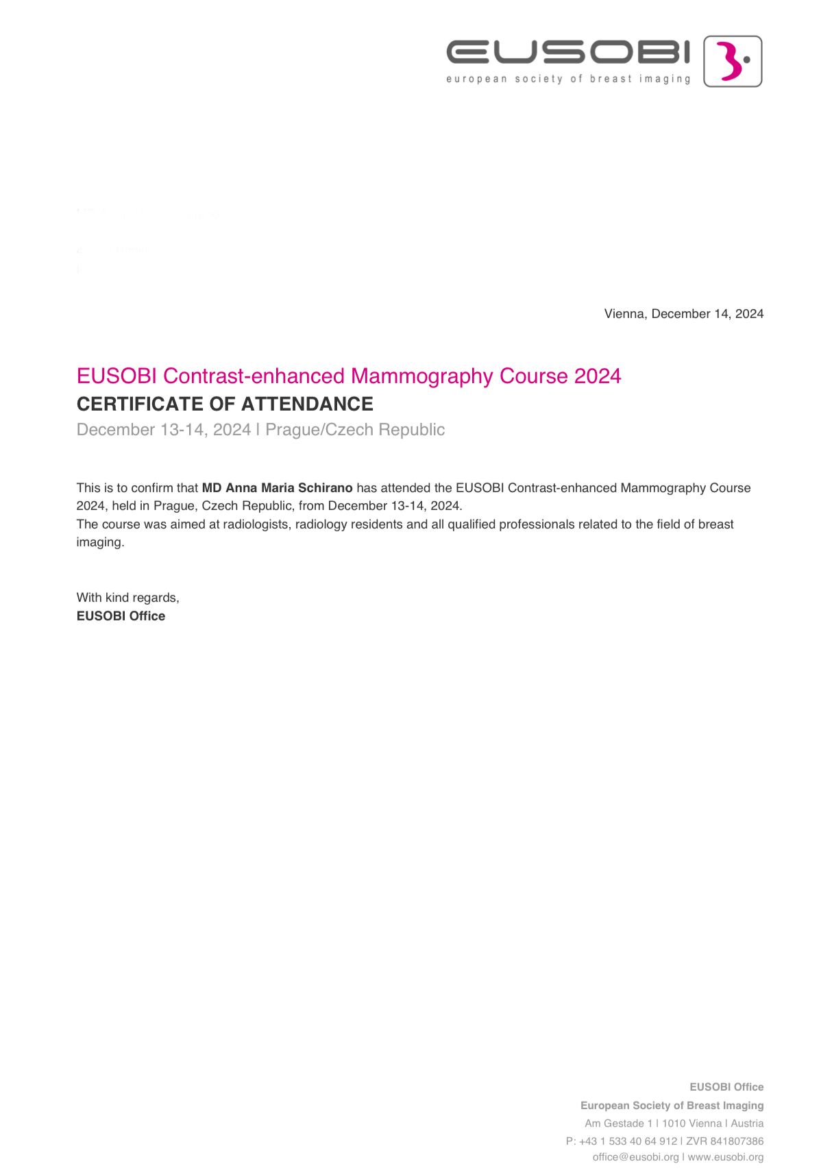 La Dott.ssa Schirano ha partecipato a numerosi corsi e seminari di aggiornamento, tra cui il “EUSOBI CEM Course 2024” e alcune delle edizioni del Corso teorico-pratico “CEM Full Immersion” organizzate dalla SOD di Diagnostica senologica dell’AOU Careggi. Ha inoltre partecipato ai principali congressi di riferimento in ambito radiologico e senologico, come quelli organizzati dalla Società Europea di Senologia (EUSOBI), dalla Società Europea di Radiologia (ESR) e dalla Società Italiana di Radiologia Medica (SIRM).