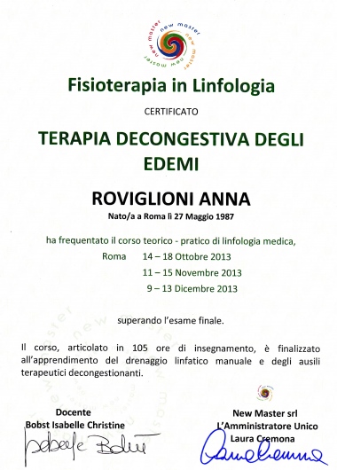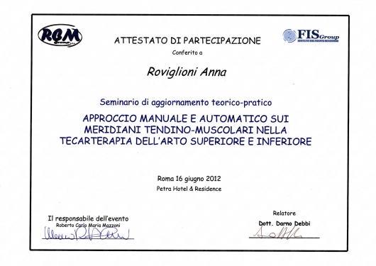 Personalmente grazie ai trattamenti di Anna Roviglioni ho avuto modo di alleviare pene e dolori fisici che provavo da molto tempo vista la professione di Chef che svolgo, che mi obbliga a stare in piedi per molto tempo durante una giornata. Il suo lavoro garantisce un giovamento duraturo nel tempo e non momentaneo. Gentilezza, cordialità e chiarezza nella spiegazione del trattamento sono le caratteristiche che contraddistinguono il lavoro di Anna!