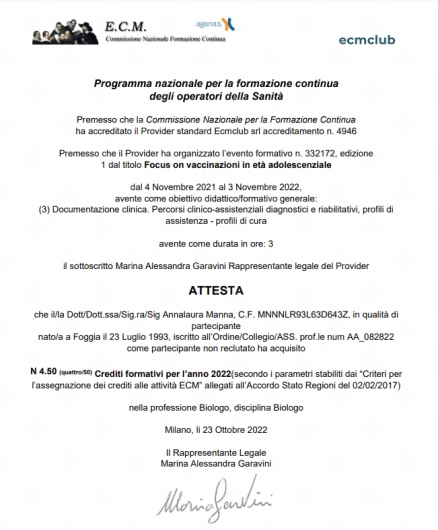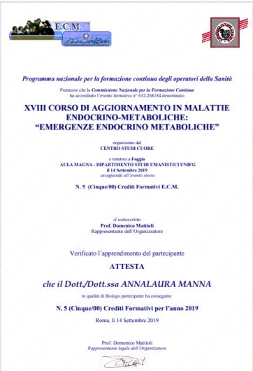 Attualmente svolgo l’attività di libero professionista presso il mio studio privato di Nutrizione Umana a Foggia, frequentando regolarmente corsi d’aggiornamento scientifici, meeting e riunioni di settore.