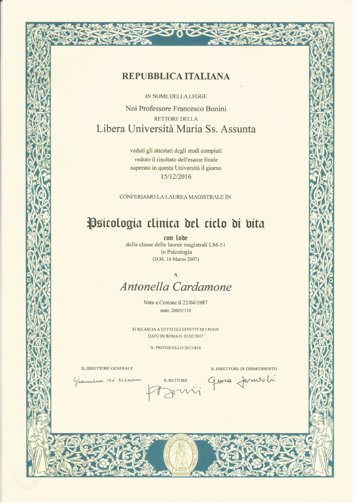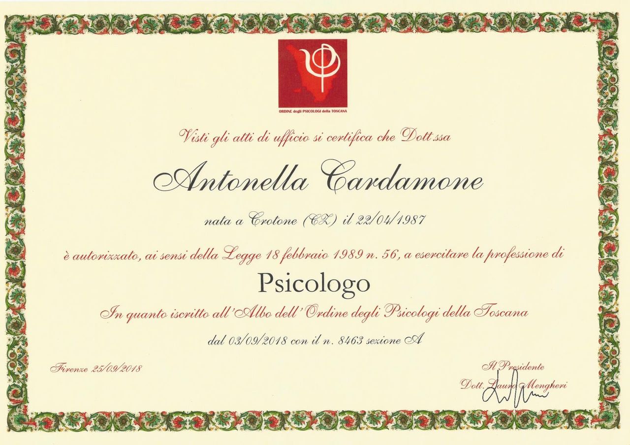 Sono Antonella Cardamone, Psicologa clinica, libera professionista dal 2018 Psicoterapeuta specializzata nel 2022 presso la scuola quadriennale I.S.I.P.S.É. (Istituto di Specializzazione in Psicologia Psicoanalitica del Sé e Psicoanalisi Relazionale) e nel 2023 ho conseguito il Master in Psico-Oncologia all'Università Cattolica di Roma.