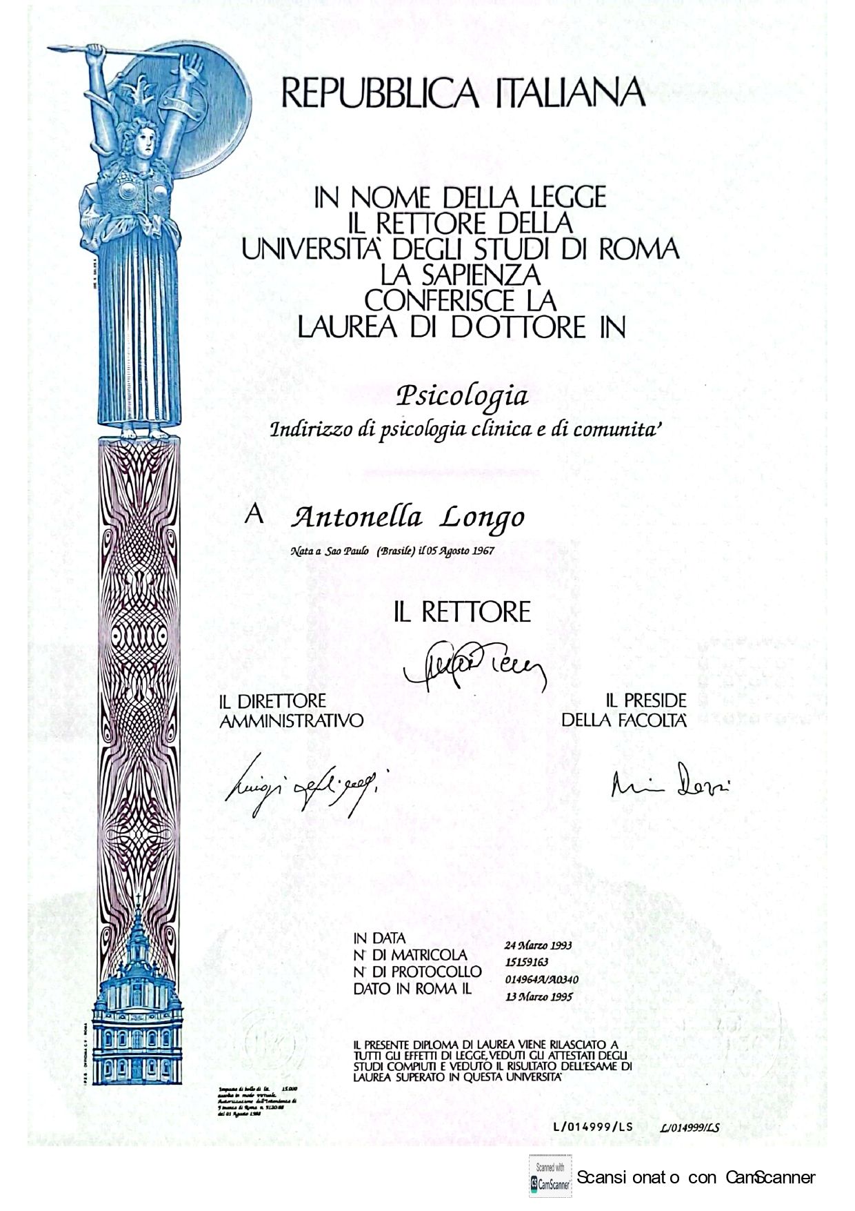 Sono la Dott.ssa Antonella Longo, svolgo da trent'anni la mia attività di psicoterapeuta con empatia, professionalità ed entusiasmo.