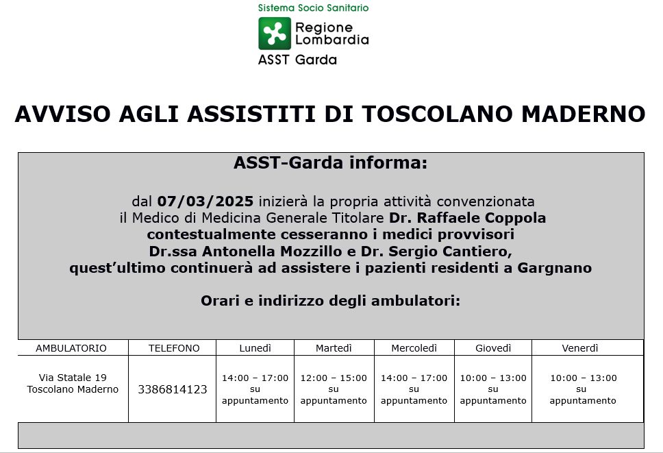 Dal 07/03/2025 inizierà la propria attività convenzionata il Medico di Medicina Generale Titolare Dr. Raffaele Coppola, contestualmente cesseranno i medici provvisori Dr.ssa Antonella Mozzillo e Dr. Sergio Cantiero, quest’ultimo continuerà ad assistere i pazienti residenti a Gargnano.