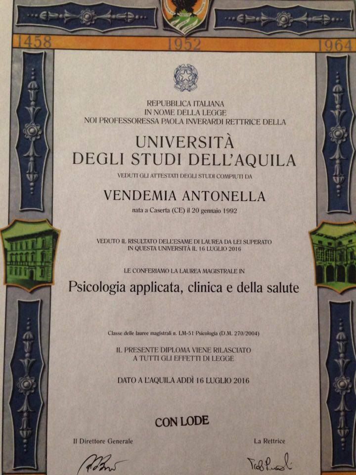 Mi sono laureata in Psicologia applicata, clinica e della salute presso "Università degli Studi dell'Aquila" con votazione 110 /110 con lode. Dopo un anno di tirocinio presso il Consultorio Materno infantile di Macerata Campania ho conseguito l’esame di stato e mi sono iscritta all’albo degli Psicologi della Campania (iscrizione n° 7682). Ho prestato servizio come psicologa in formazione presso Hospice Nicola Falde con pazienti oncologici e familiari. Ho lavorato come educatore presso casa famiglia "Alba" e come psicologa in diversi progetti scolastici.