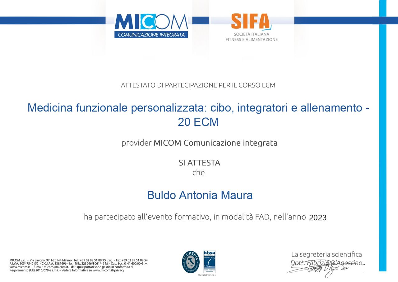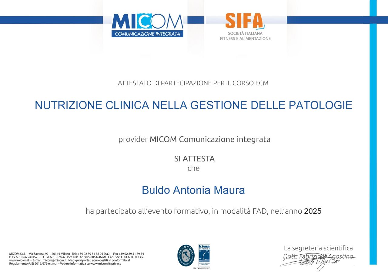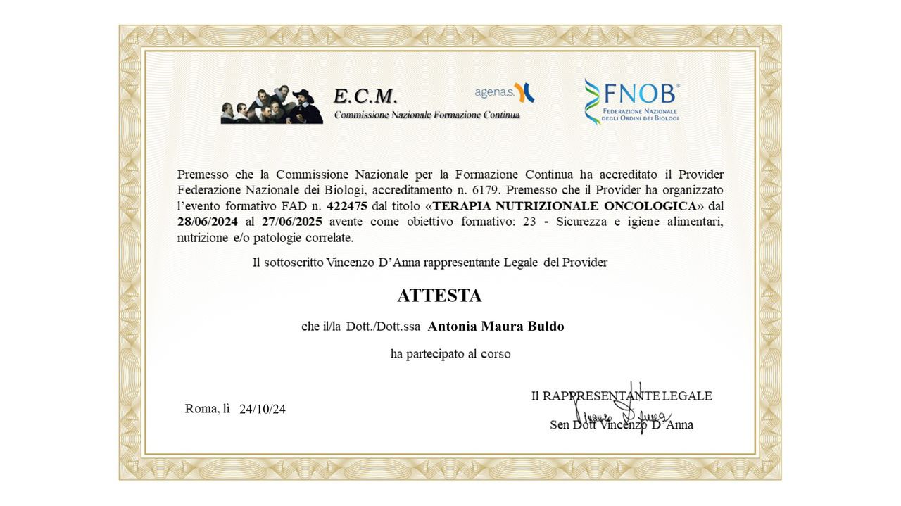 Continuo ad arricchire il mio bagaglio professionale mediante la partecipazione a convegni e corsi di formazione sulla nutrizione umana, le relative patologie e cure innovative.