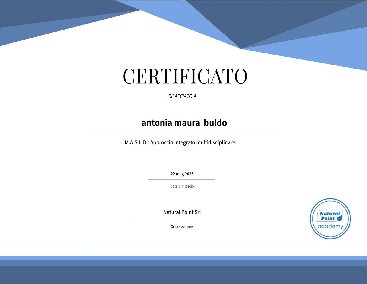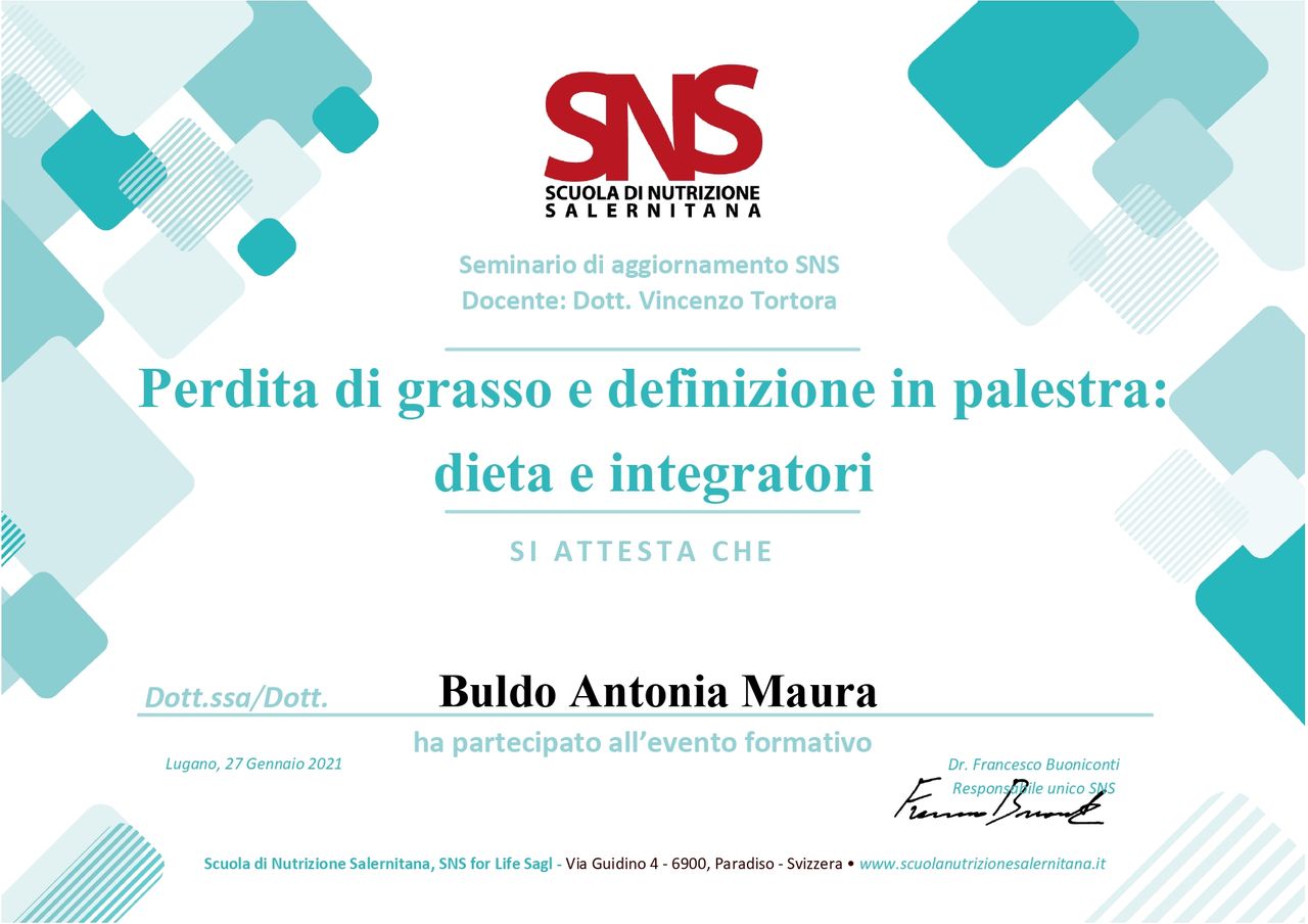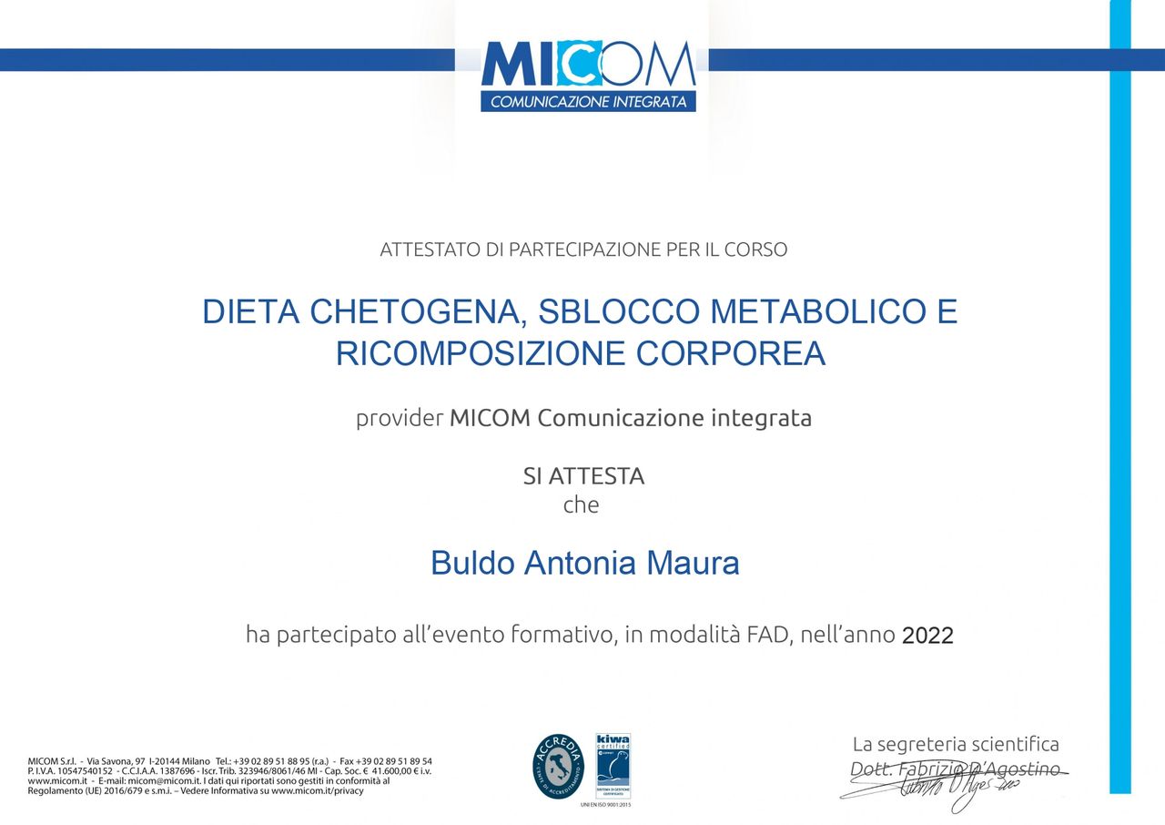 Continuo ad arricchire il mio bagaglio professionale mediante la partecipazione a convegni e corsi di formazione sulla nutrizione umana, le relative patologie e cure innovative.