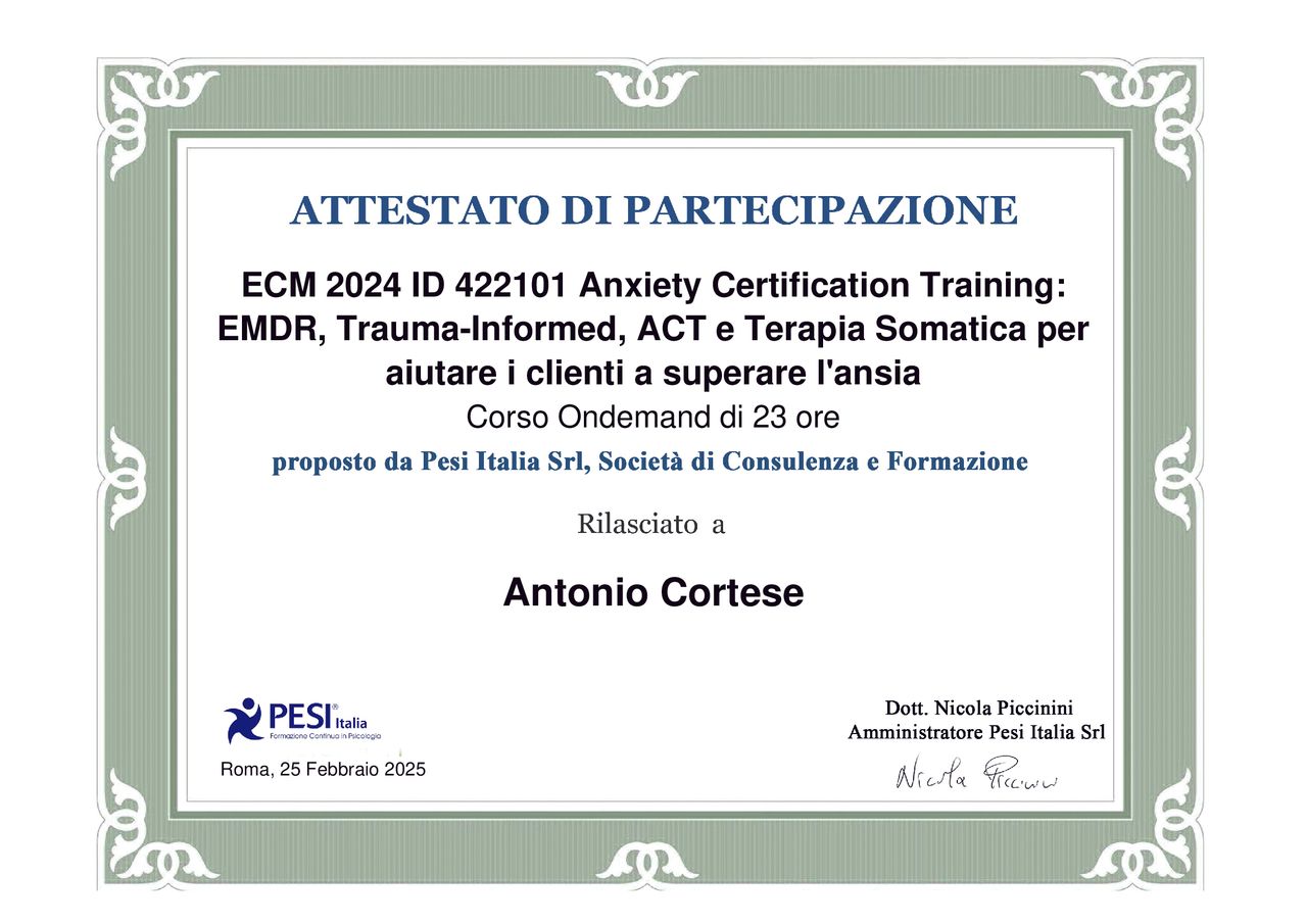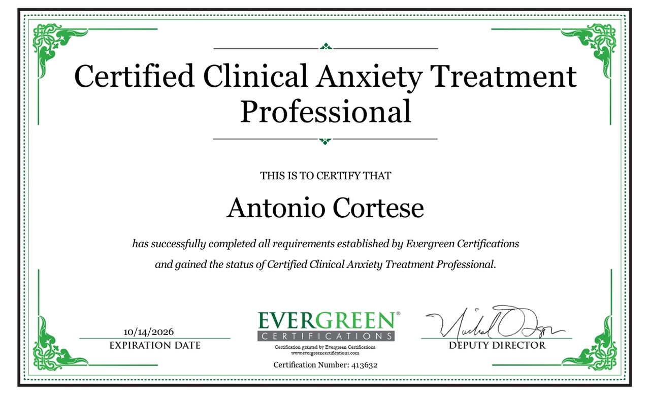 Sono il Dott. Antonio Cortese, Psicologo, Psicologo dello Sport e del Benessere, Esperto in Psicologia Positiva, Mindfulness e Gestione Emotiva. Certificato Internazionale Evergreen per il Trattamento dei Disturbi d'Ansia.