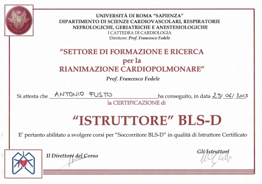 Nel 2013 ha conseguito la qualifica di Istruttore BLSD Adulto, Bambino e Lattante (Basic Life Support Defibrillation), rilasciata dalla Società Italiana di Cardiologia.