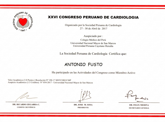 Nel 2017 viene nominato "Membro Corrispondente" della Società Peruviana di Cardiologia.