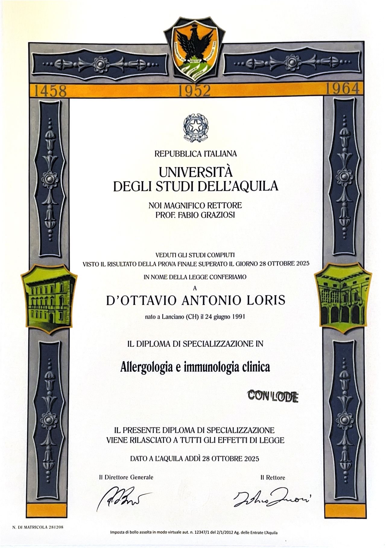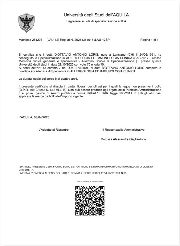 Sono un Medico, specialista in Allergologia ed Immunologia Clinica. Mi dedico in particolare alle allergie respiratorie, alimentari e farmacologiche. Durante gli anni di formazione ho frequentato i reparti di Allergologia Ospedalieri di Teramo, Avezzano e Chieti dove mi sono appassionato alla diagnostica dell'allergia al veleno di imenotteri e a quella delle reazioni avverse a farmaci. Il continuo aggiornamento e' alla base della mia professione che porto avanti anche in contesti nazionali e internazionali.