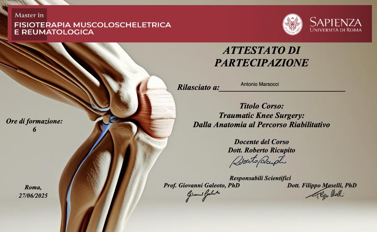 Dopo la rottura del legamento crociato, mi sono affidato ad Antonio Marsocci e non potevo fare scelta migliore. Ha impostato un programma preciso e graduale, iniziando con esercizi mirati di flessione ed estensione del ginocchio che mi hanno aiutato a recuperare mobilità, forza e sicurezza nei movimenti. Con grande attenzione ha seguito ogni fase del mio recupero, spiegando tutto con professionalità e chiarezza. Dopo tre mesi, grazie al suo metodo, sono tornato a correre sul tapis roulant, eseguendo correttamente ogni movimento e rispettando i giusti tempi di carico. Antonio è una persona affidabilissima, esperta soprattutto negli infortuni al crociato, e per me è uno dei migliori nel suo campo. Oltre alla sua grande competenza, è anche molto gentile, educato, disponibile e sempre pronto a motivarti. Qualità che fanno davvero la differenza. Lo consiglio vivamente a chi cerca un fisioterapista serio, competente e appassionato del proprio lavoro.