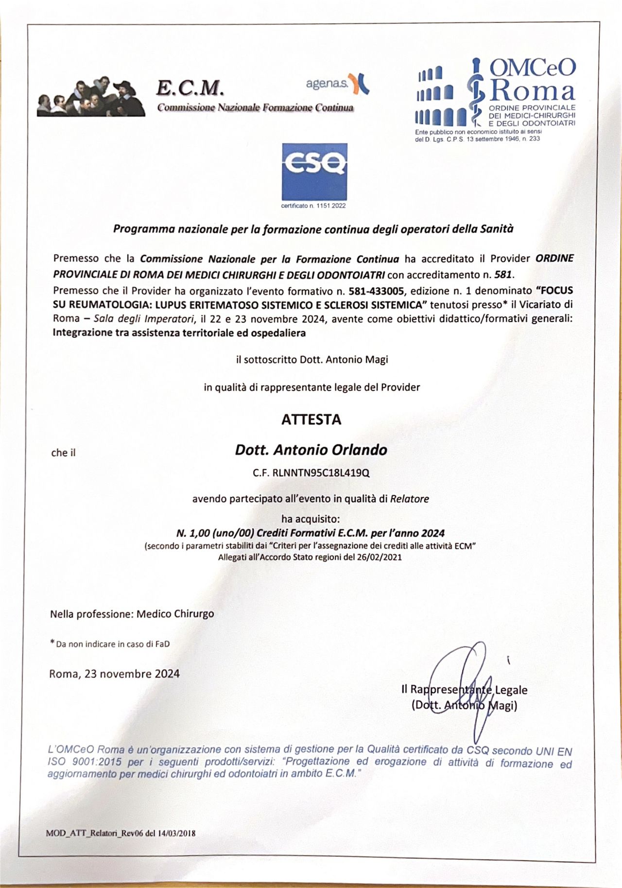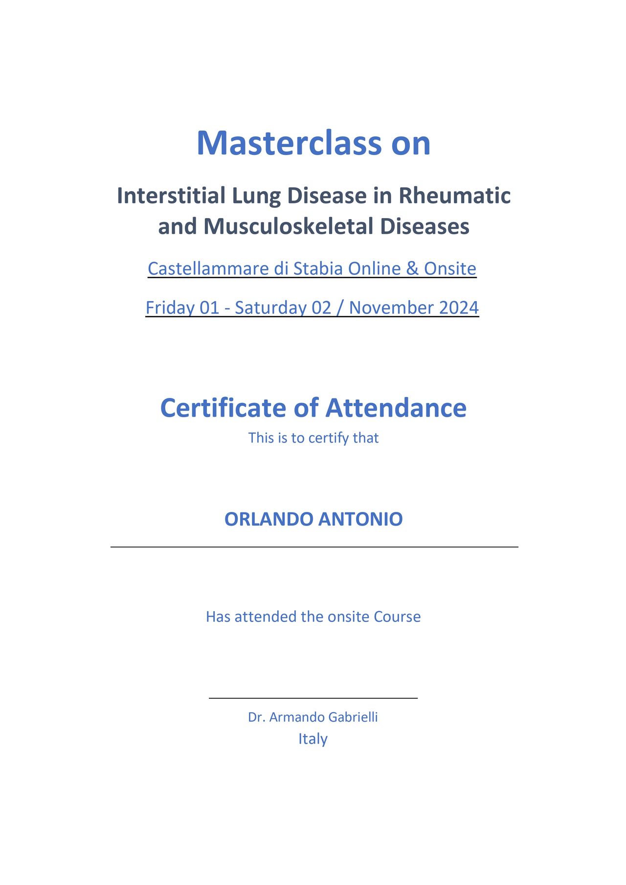 Partecipo regolarmente a congressi nazionali e internazionali di ambito reumatologico e immunologico, anche in qualità di relatore o presentando contributi scientifici, e a percorsi di formazione avanzata e masterclass, con l’obiettivo di mantenere un costante aggiornamento professionale.