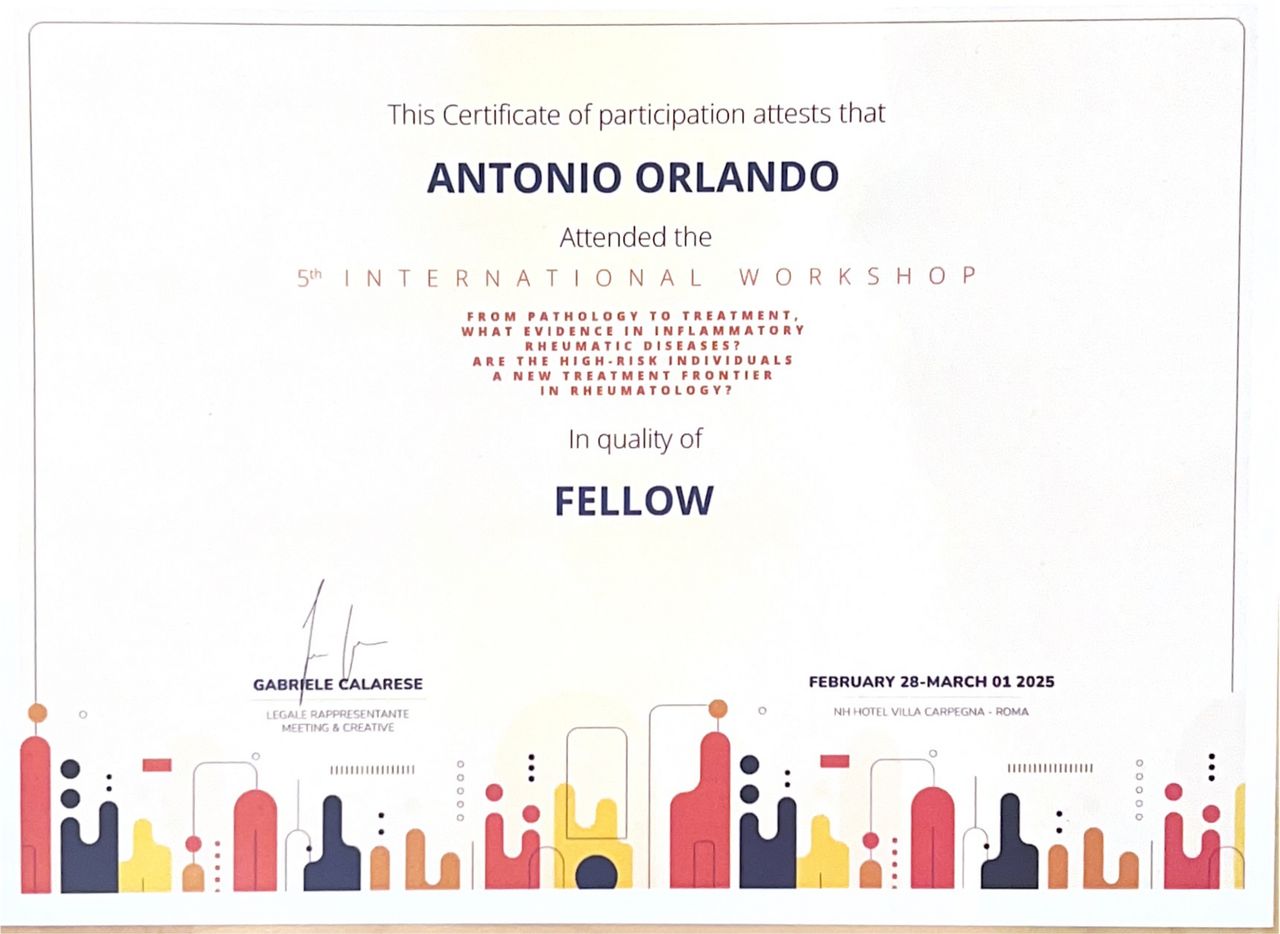 Mi sono formato presso la Scuola di Specializzazione dell’Università Campus Bio-Medico di Roma, maturando una solida esperienza nella presa in carico globale del paziente reumatologico, dalla fase diagnostica alla definizione e al monitoraggio del percorso terapeutico, in diversi contesti assistenziali.