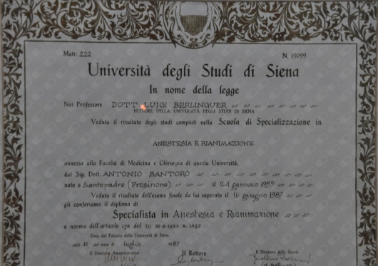- Specializzazione in Anestesia e Rianimazione conseguita presso l’Università degli Studi di Siena (giugno 1987);