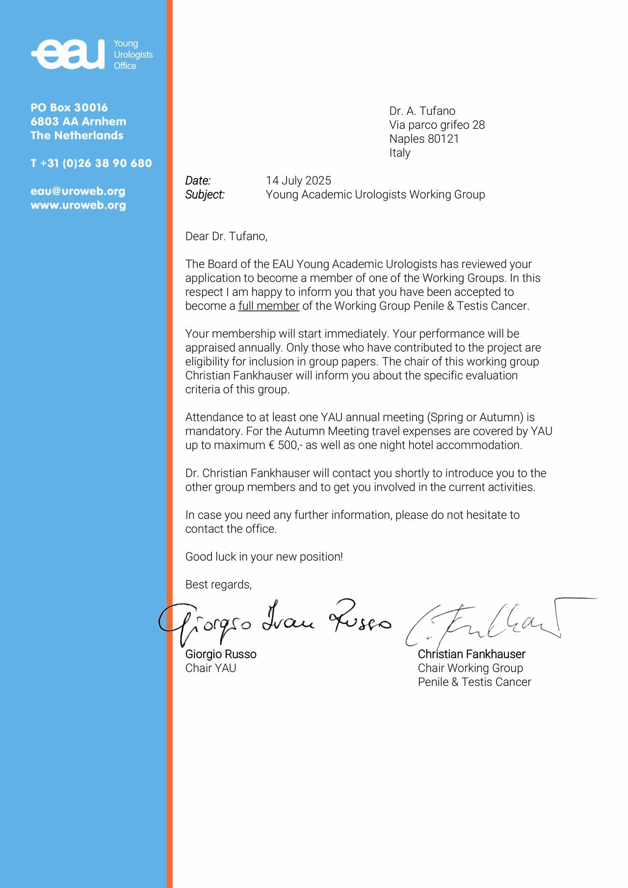 È inoltre autore e co-autore di oltre 100 pubblicazioni scientifiche su riviste nazionali e internazionali, e partecipa attivamente a numerosi gruppi di ricerca, tra cui lo Young Academic Urologists (YAU) della Società Europea di Urologia e il Comitato Scientifico Nazionale UROP.