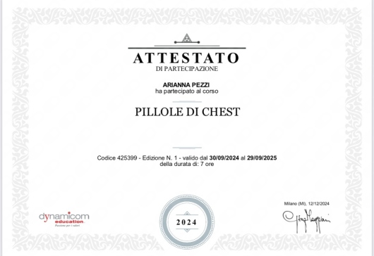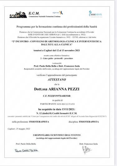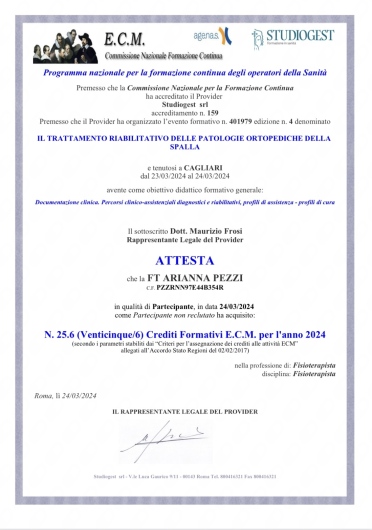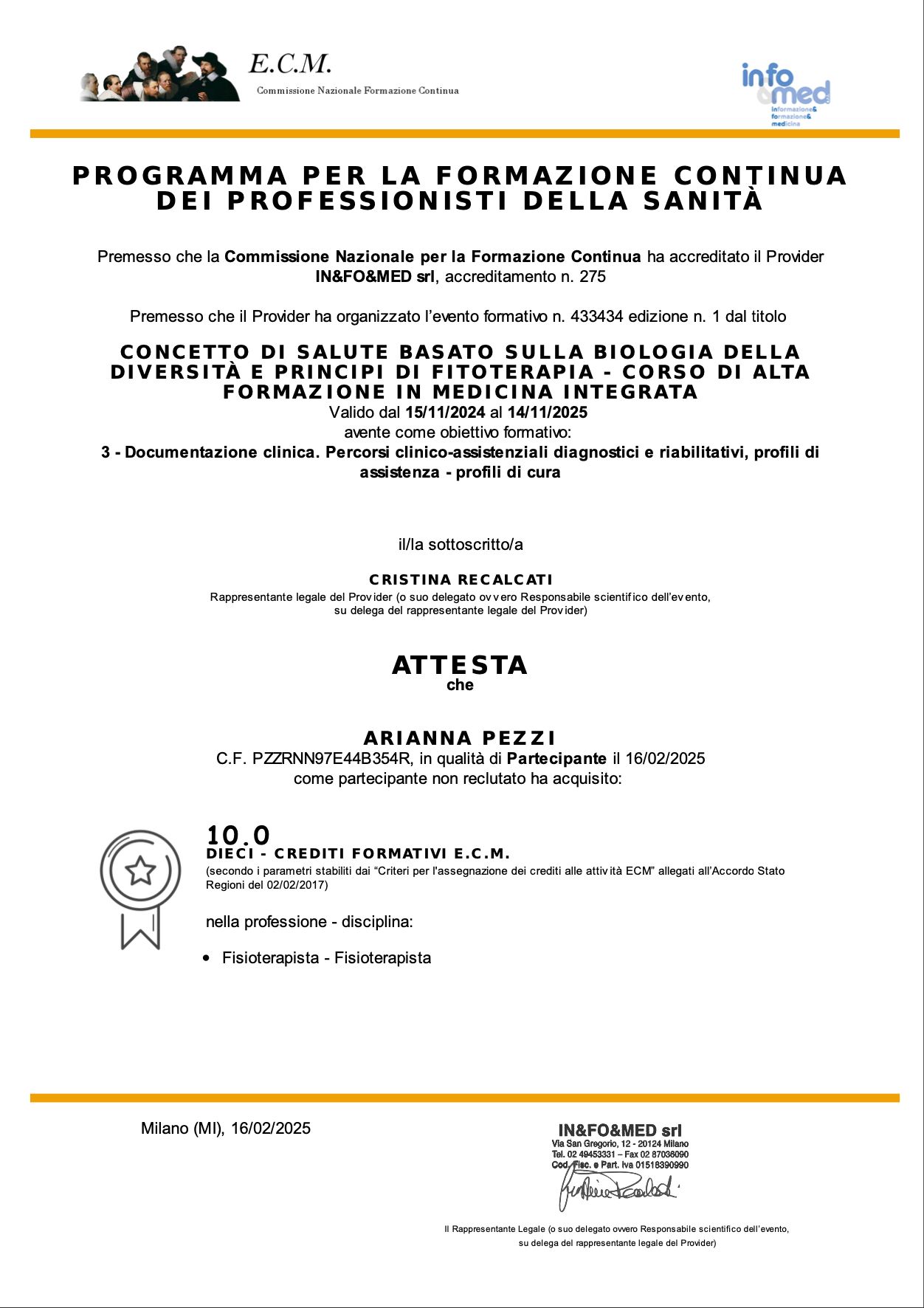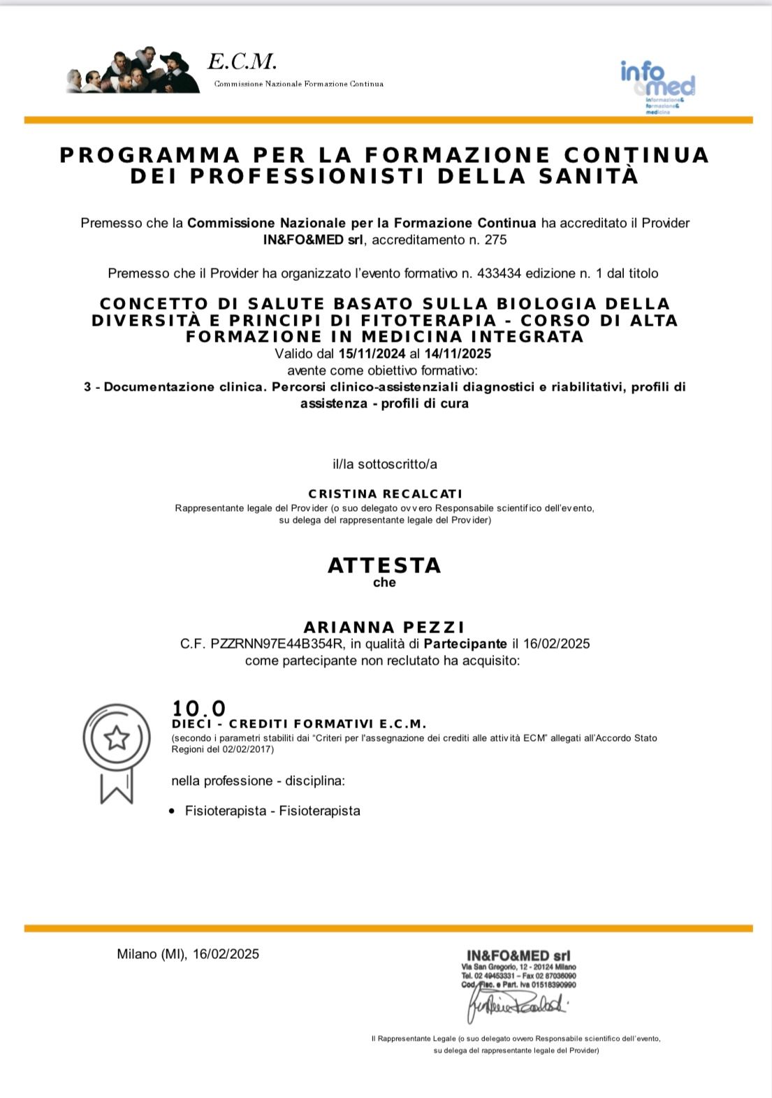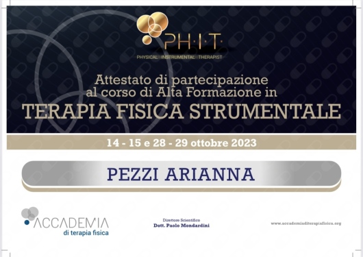 La Dott.ssa Pezzi Arianna si laurea nella facoltà di medicina e chirurgia CdL in Fisioterapia il 27/11/2020 con una valutazione pari a 110 su 110 con Lode. Successivamente consegue e pieni voti il Master in Osteopatia presso Università Pegaso il 30/05/2022
