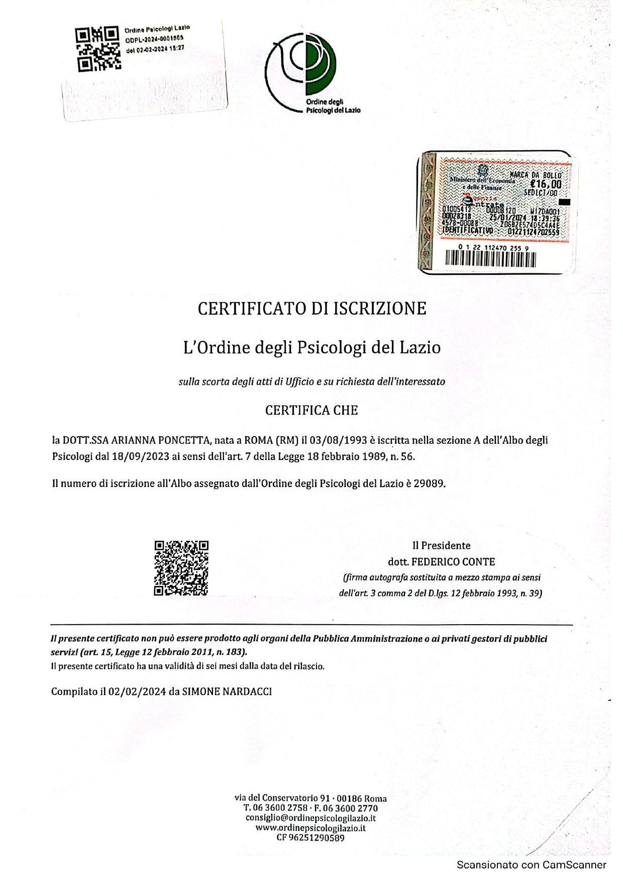 Sono la dottoressa Arianna Poncetta, sono una psicologa ed una psicoterapeuta sistemico- relazionale in formazione presso la “Scuola Romana di Psicoterapia Familiare”.