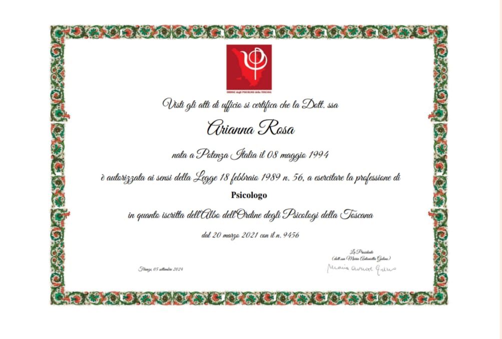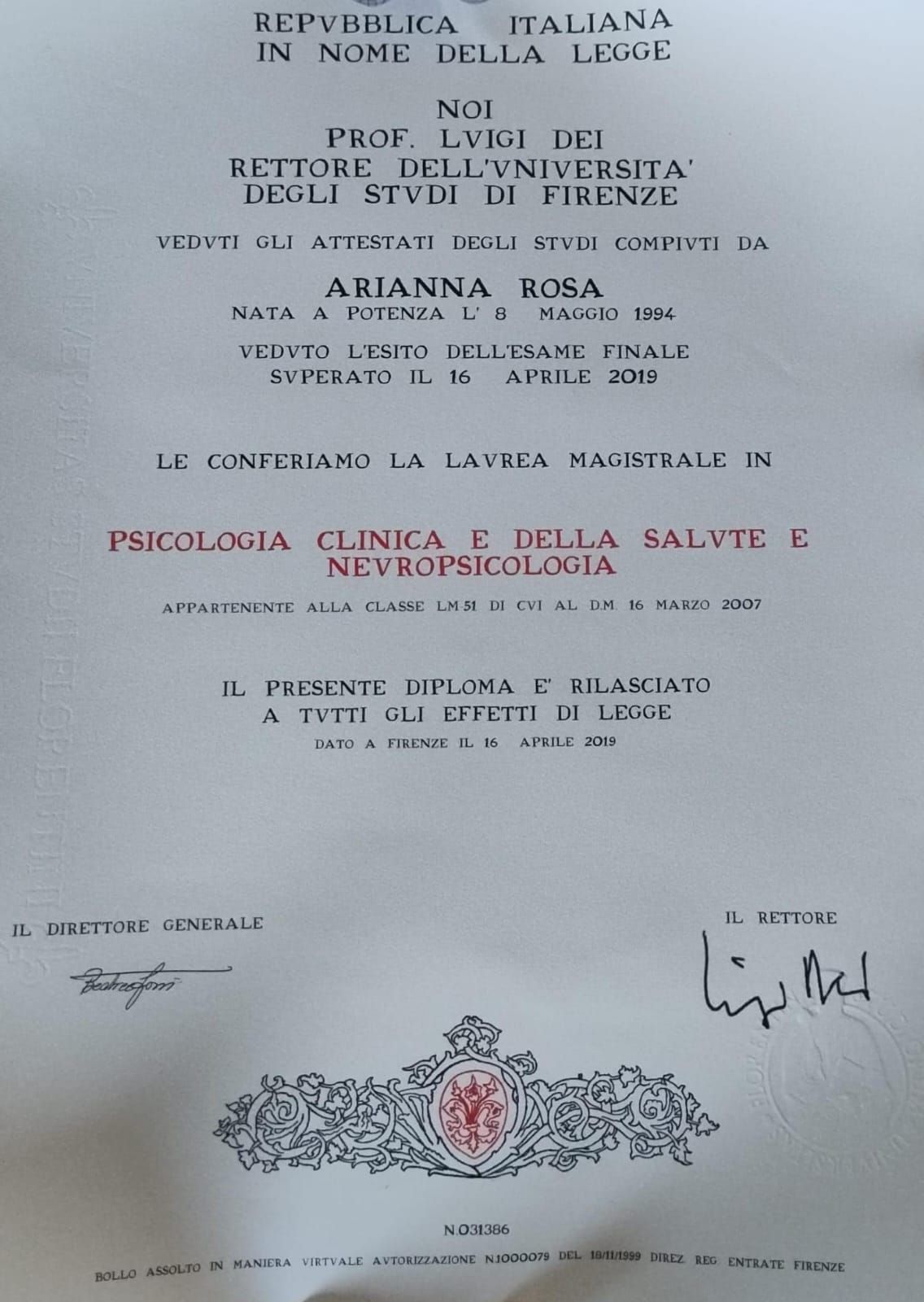 Ho avuto il piacere di fare un’ esperienza significativa e preziosa con la Dottoressa Arianna. Fin dal primo incontro mi sono sentita accolta, compresa e accompagnata da una professionista attenta e sensibile. Il suo modo di lavorare mi ha permesso di aprirmi, di crescere e di portare a termine il percorso che abbiamo fatto insieme