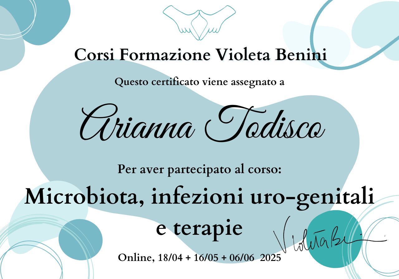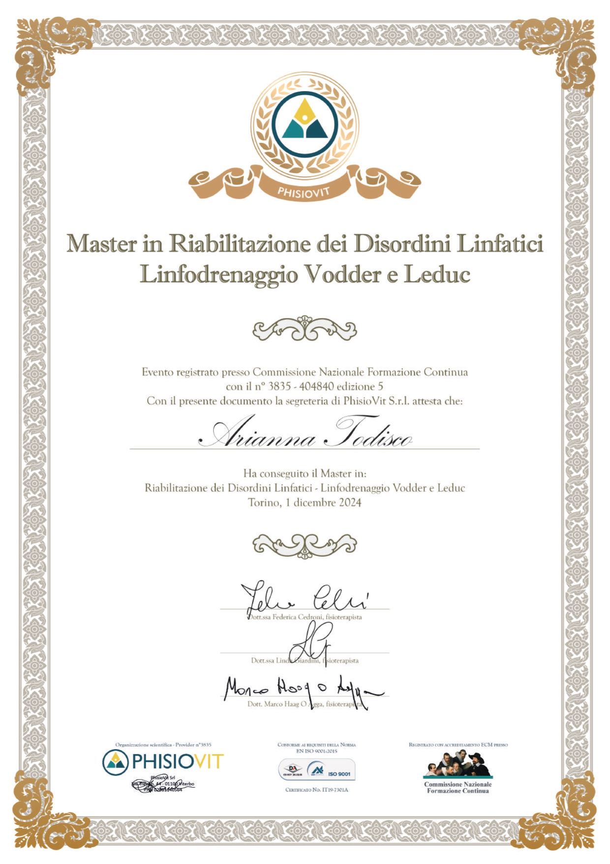 Sono Arianna Todisco, laureata in Fisioterapia presso l'Università del Piemonte Orientale con votazione 110/110. Ho conseguito un Master in Terapia Manuale e Riabilitazione Muscolo-Scheletrica ottenendo il punteggio di 110L/110, specializzandomi successivamente nella riabilitazione dei disordini linfatici, nella riabilitazione oncologica rivolta alle donne sottoposte a chirurgia senologica.